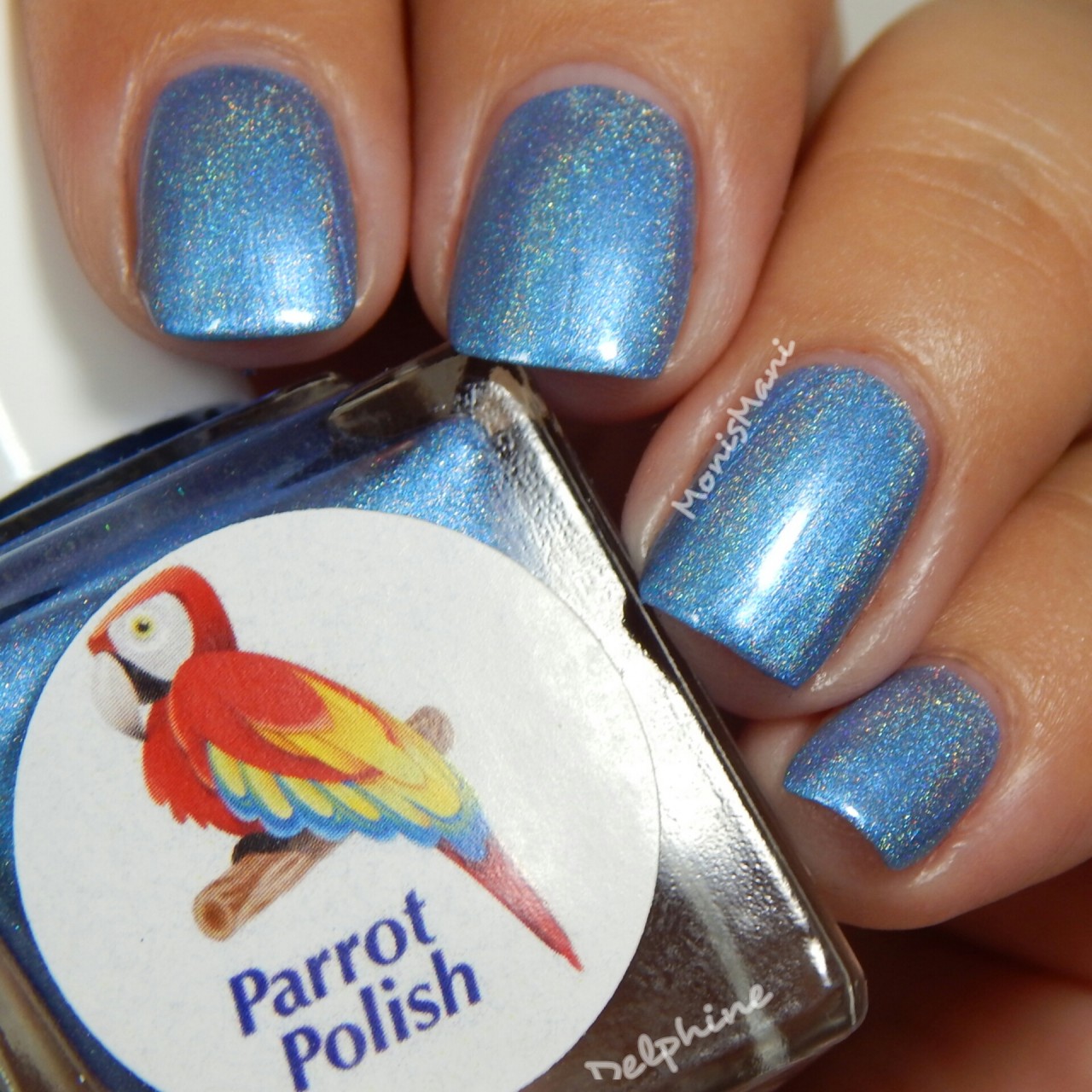 How are you today?? My beloved Parrots came out with a new holo! It is no secret that I have a very tight and long relationship with the brand  Parrot Polish and I LOVE getting goodies from them! Today I want to show you this gorgeous blue holo called Delphine, isn’t she pretty? two super flowy coats plus top coat in the pic.