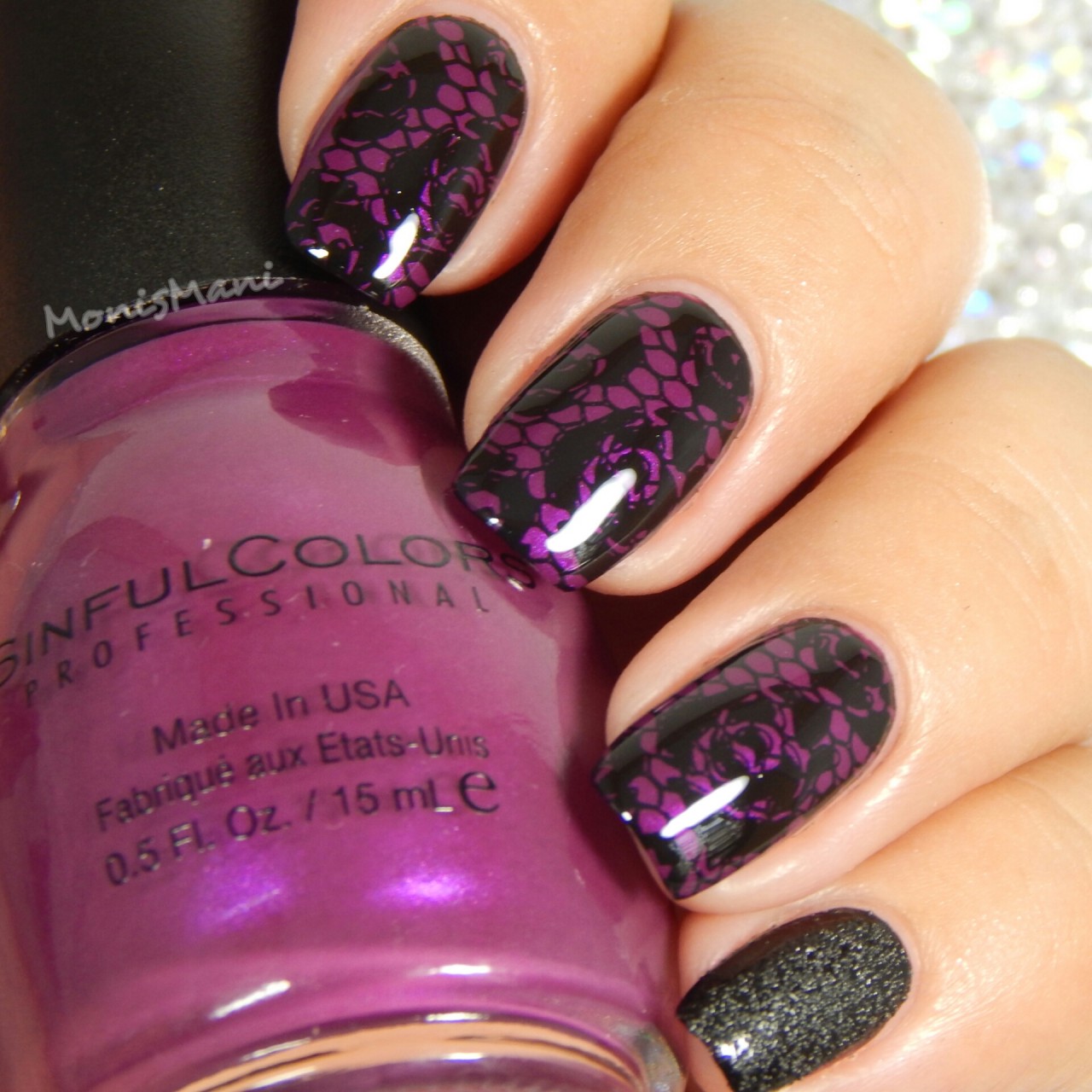 For said upgrade I stamped Fig with Konad black and used a plate from the Pueen Love Elements  Set (I’d been saving this image for  a base like this) . Used Sally Hansen’s “Lick-o-Rich” from the Sugar Coat line to add texture to my mani.