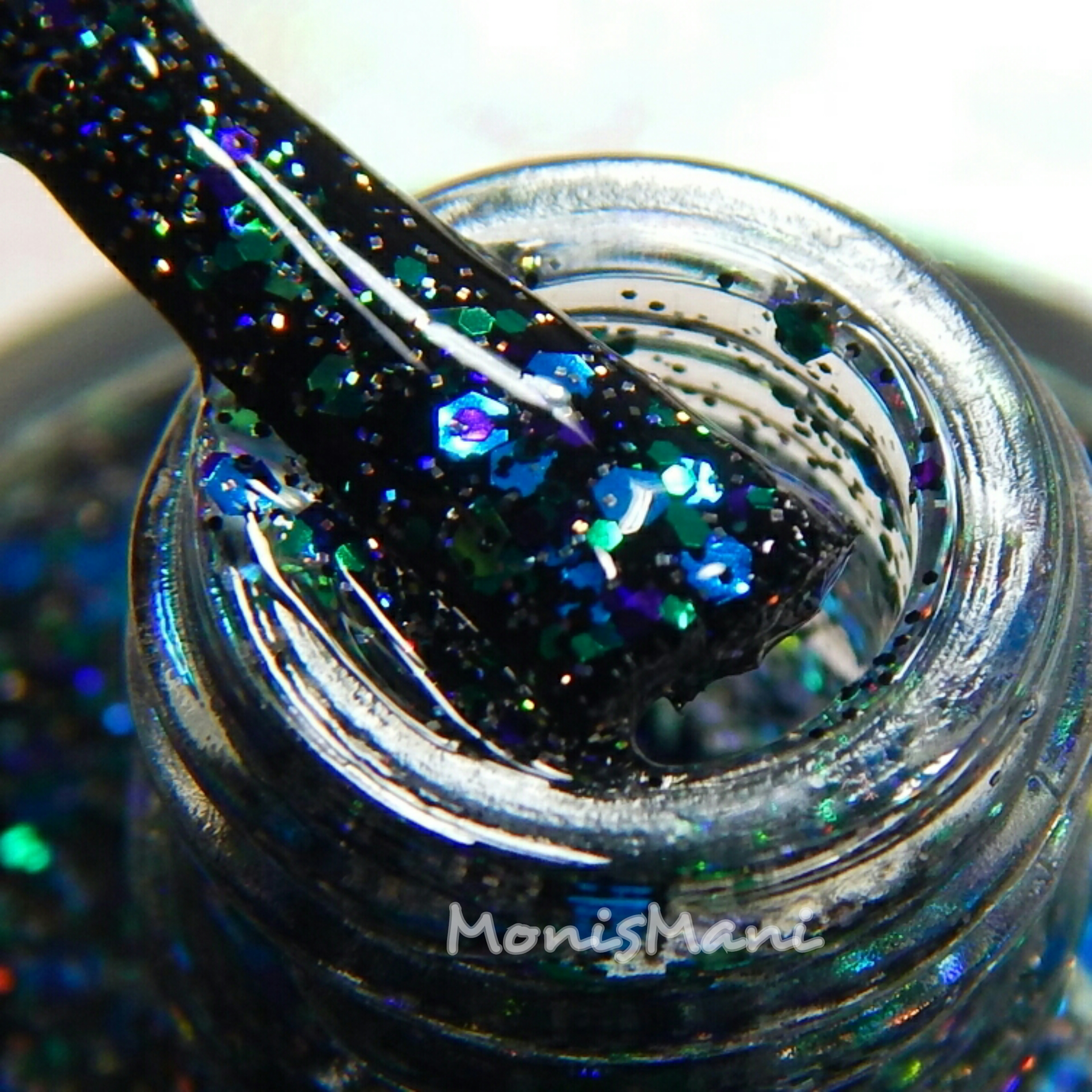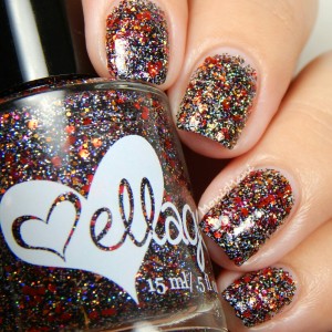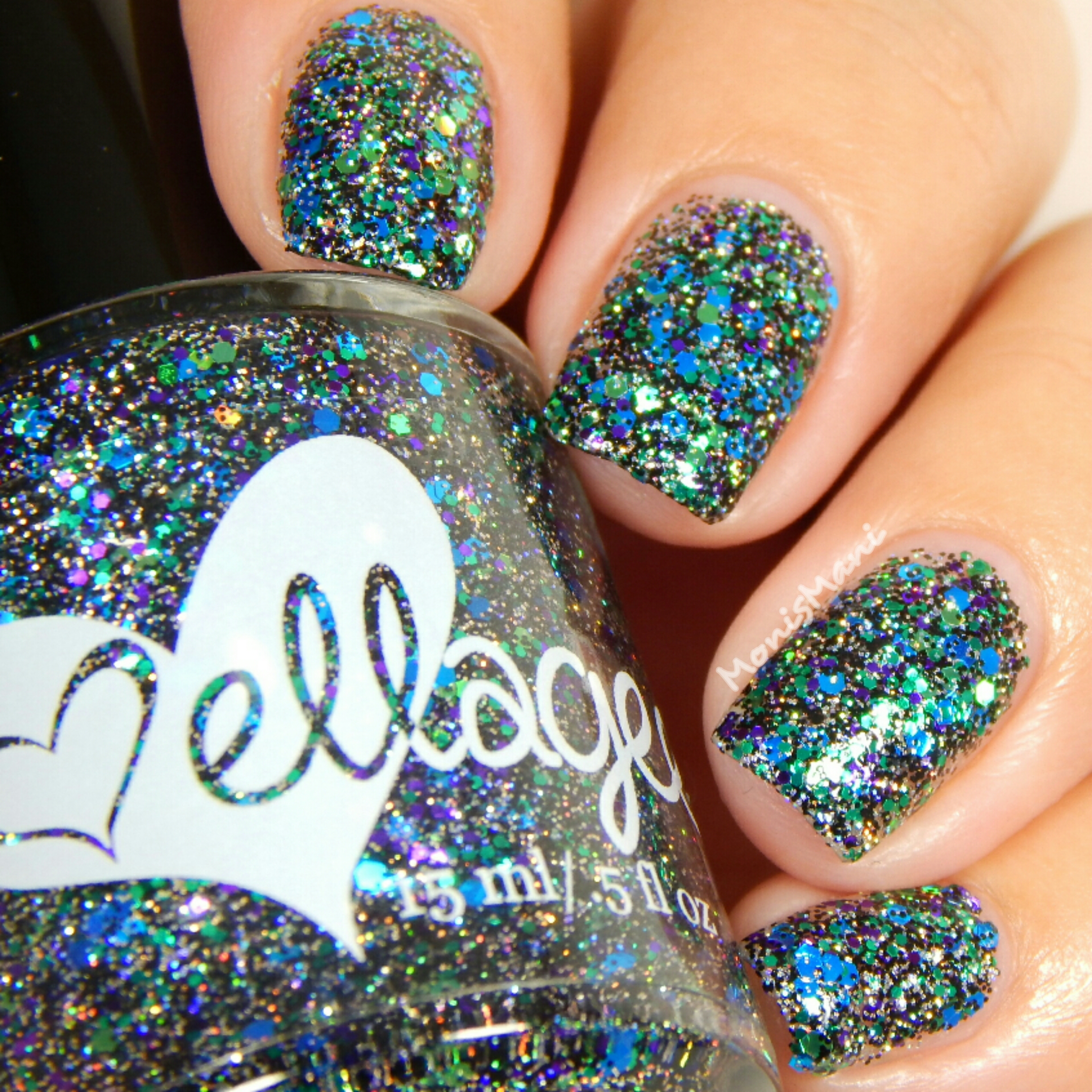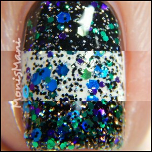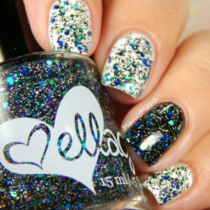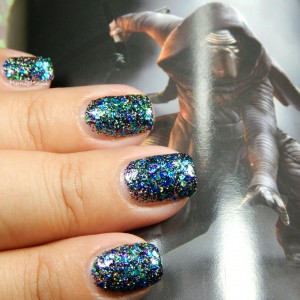 Is a clear base with metallic and holo glitter in Jedi shades of green, blue, and purple with holo microglitter in black and silver as described by maker. You see it here by itself with one normal coat + one sponged coat topped with Glass (ellagee’s very own fast drying top coat)