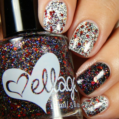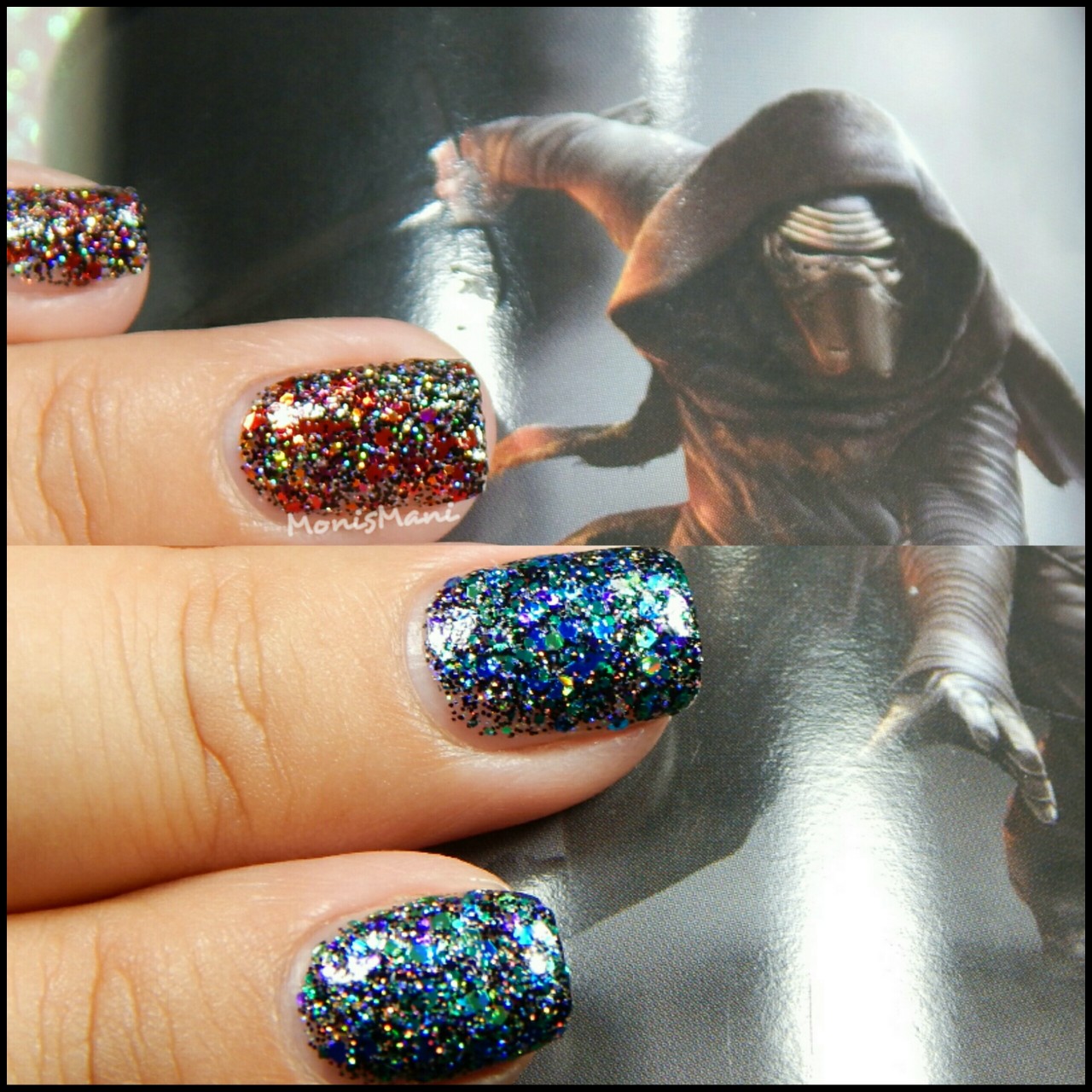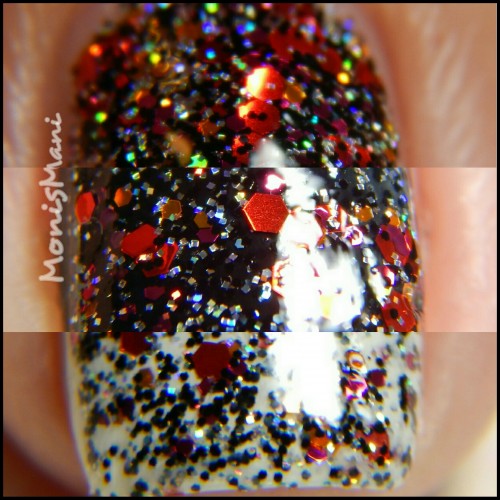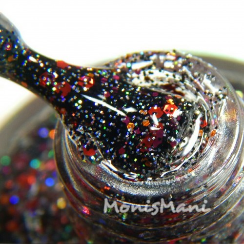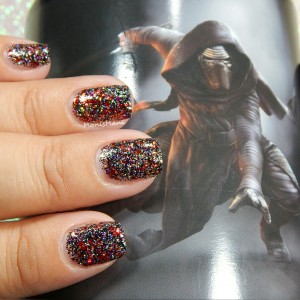 Is a clear base with metallic and holo glitter in Sith shades of red, magenta and orange with holo microglitter in black and silver as described by the maker. Love the “Sith” part hehe.. You see it here by itself in one normal + one sponged coat and topped with Glass