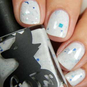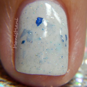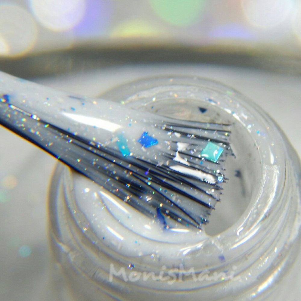 A beautiful white crelly filled with white holo glitters, large blue flakies and blue square glitters. You see 3 coats plus glossy top coat in the pics