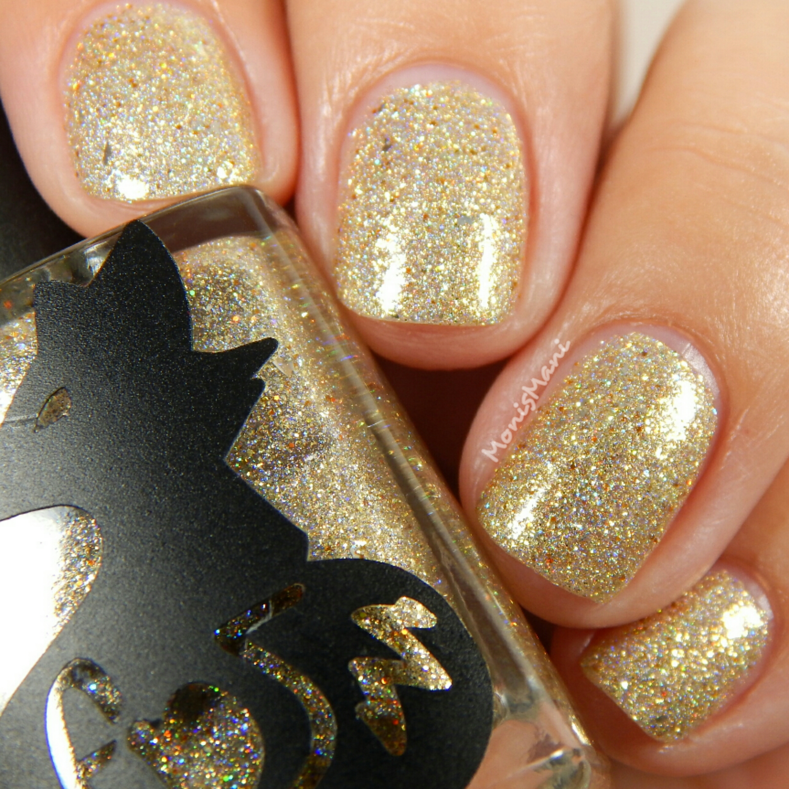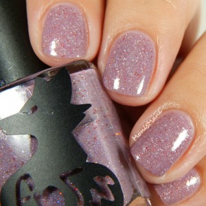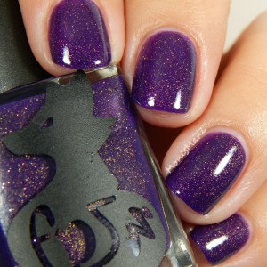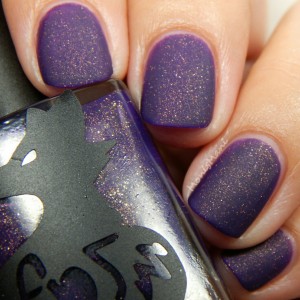 Purple creme filled with gold glitters. Super pretty and one of my favorites from the collection! 2 coats plus glossy and matte top coat in the pics
