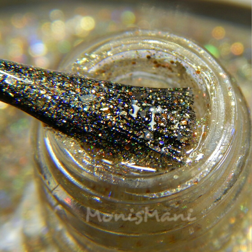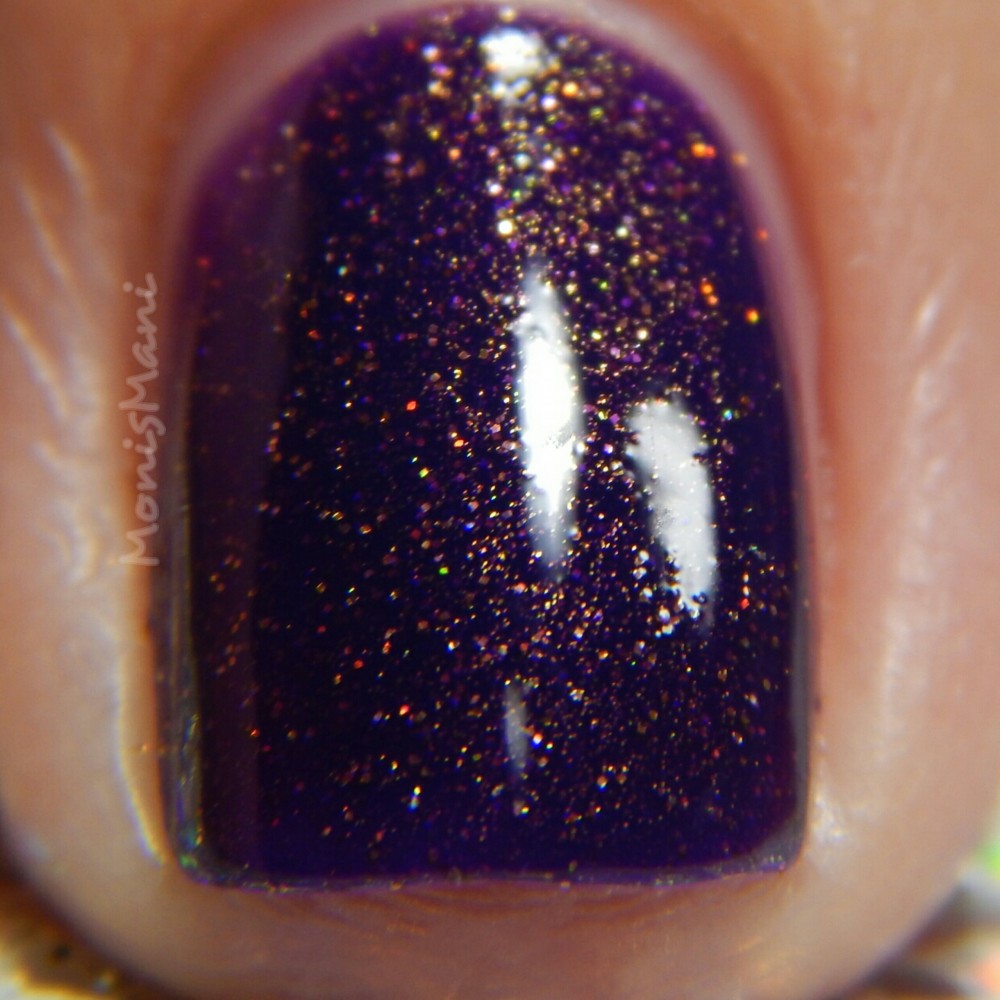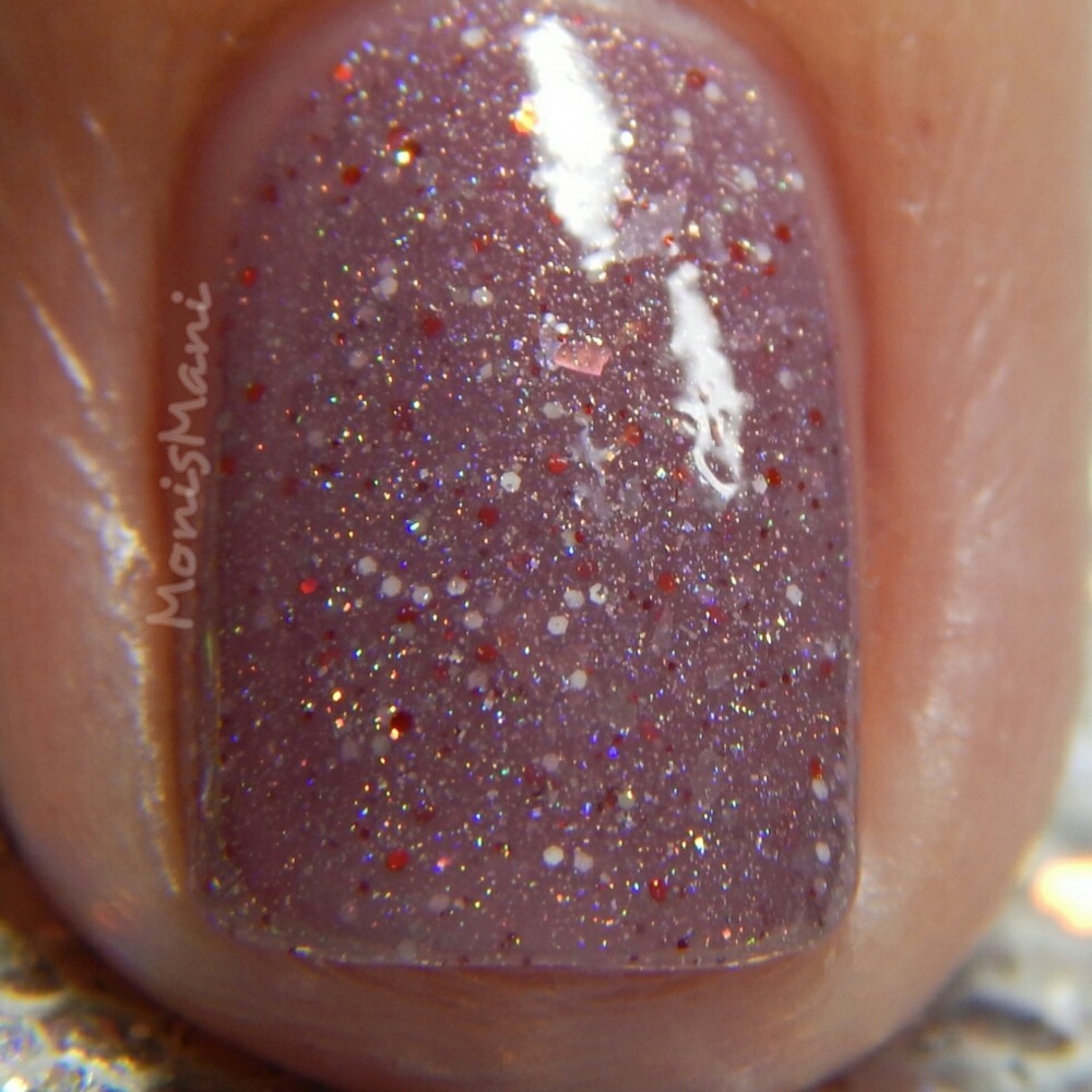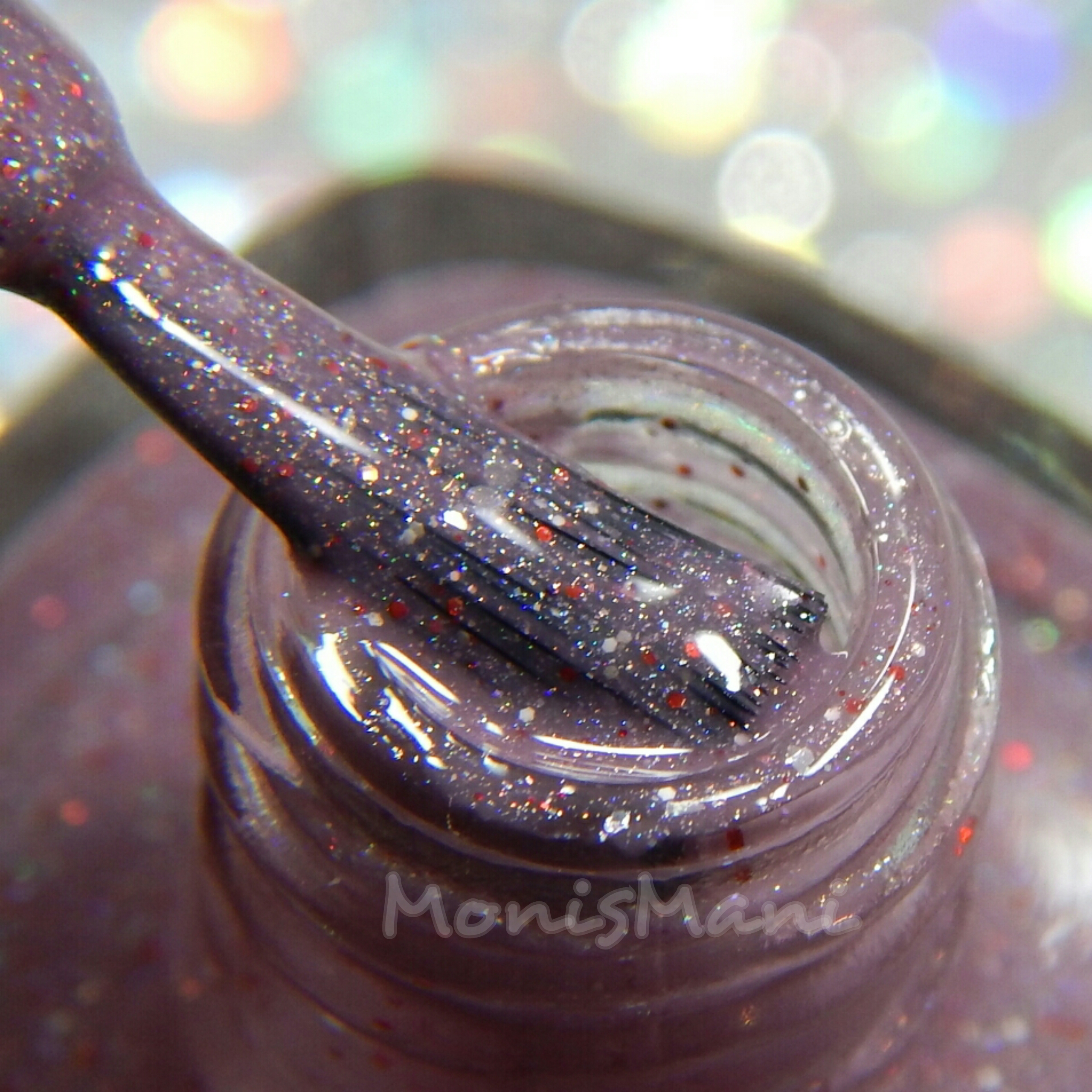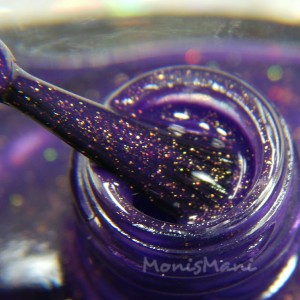Bronze microglitter and flakie on clear base. The glitters give it a bit of a purple hue. Just GORGEOUS. 3 thin coats plus glossy top coat in the pics