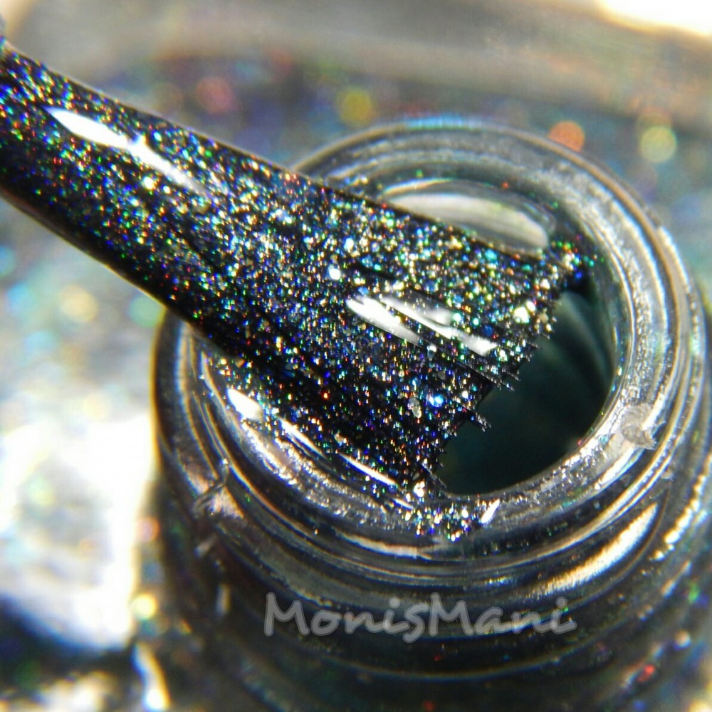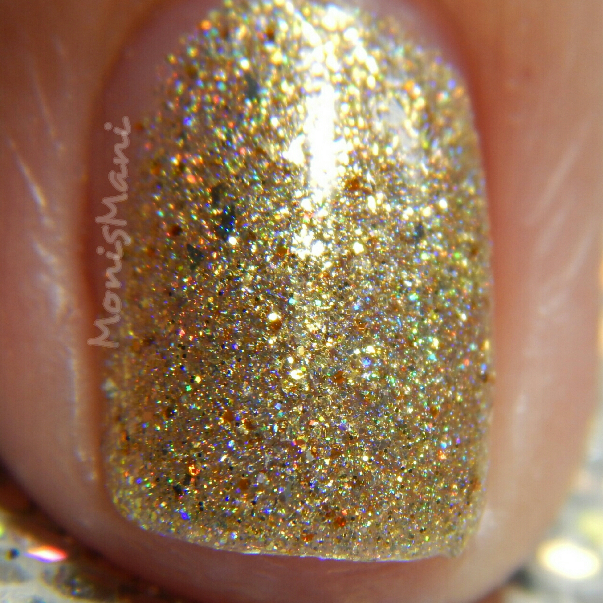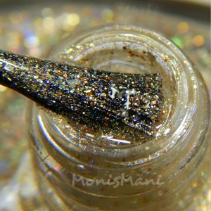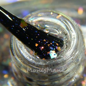 Micro glitters and flakies in clear base, 3 thin coats plus glossy top coat in the pics
