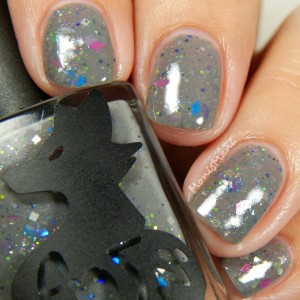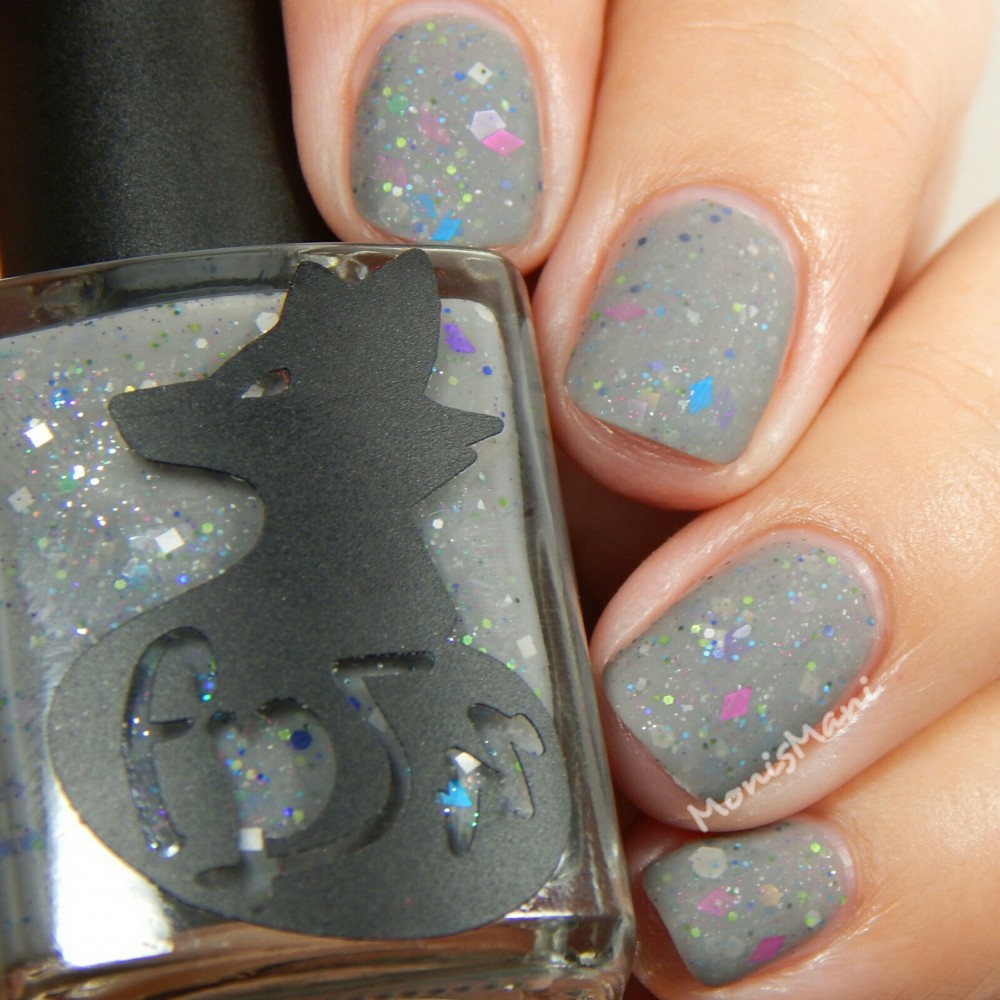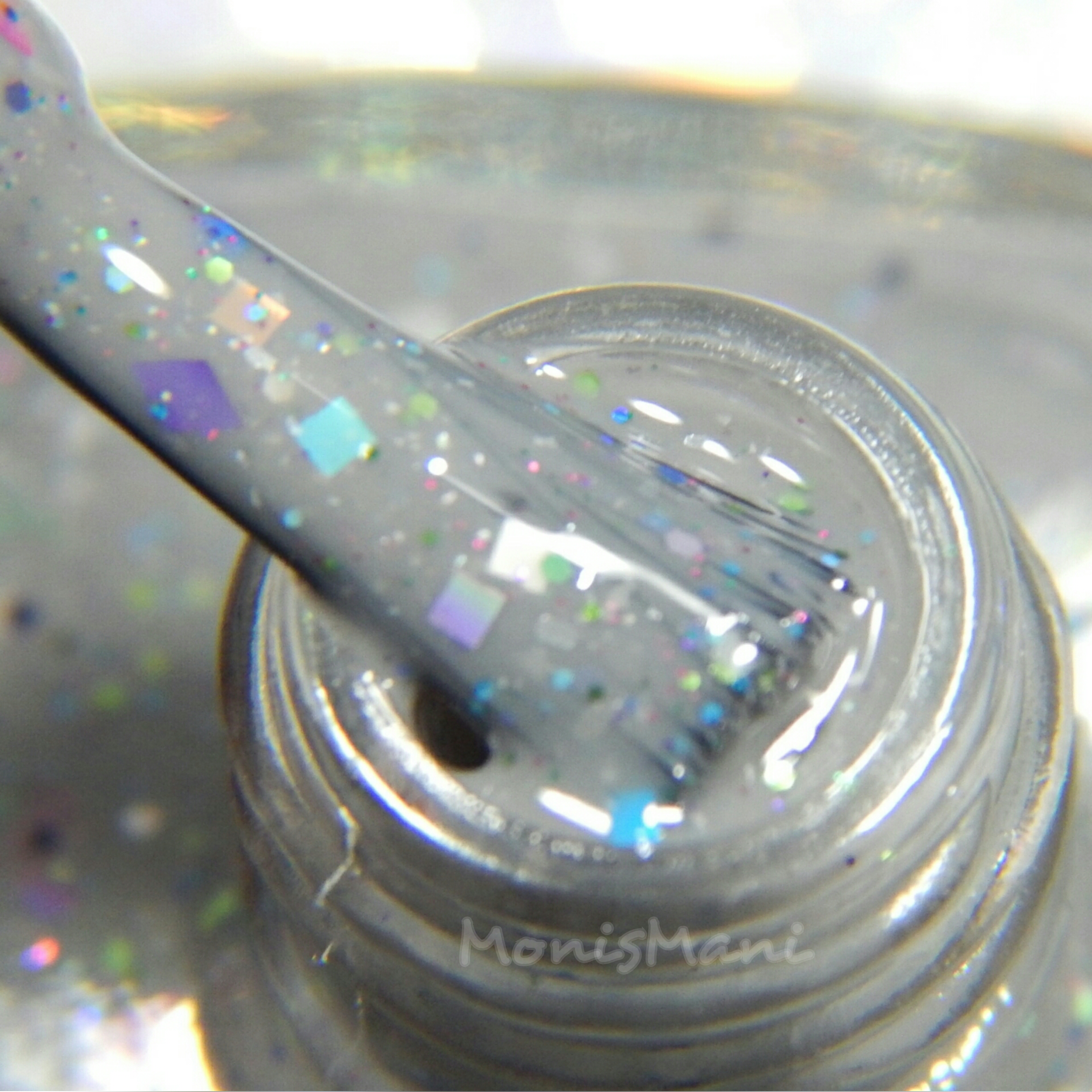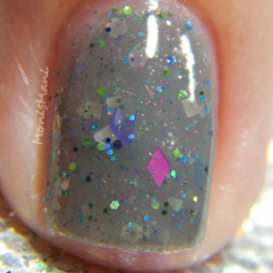 Soft smokey gray crelly filled with glitters of different shapes and sizes in light blue, lavender, blue and purple. 3 coats plus glossy and matte top coat in the pics.