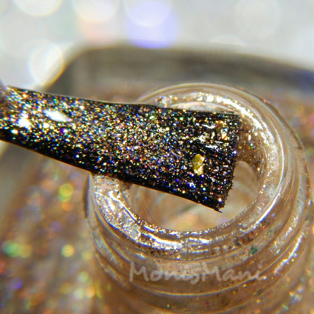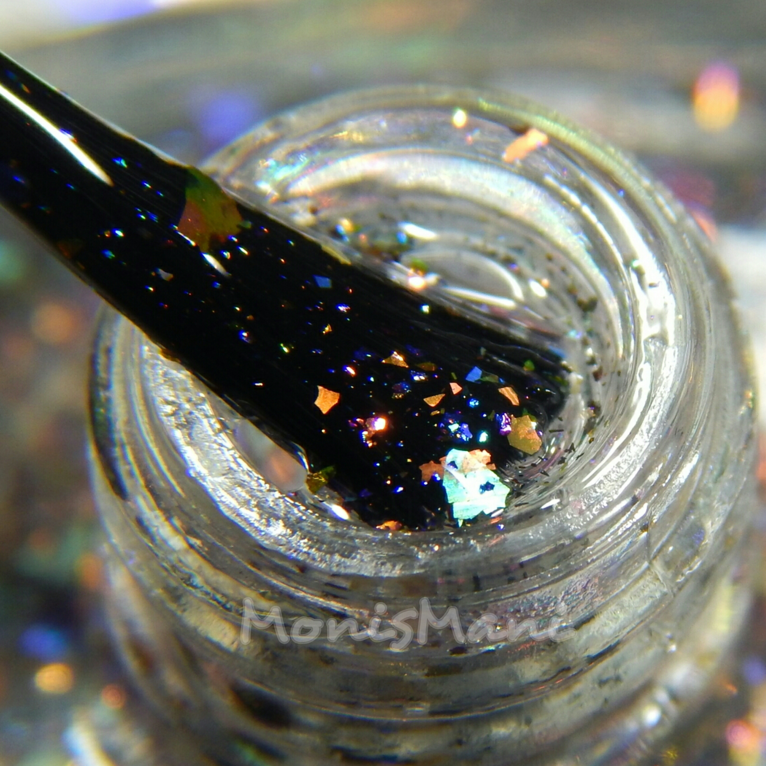 A gorgeous flakie top coat that can be brought to opacity in two easy sponged coats.. there is one brushed + dabs (I thought two coats would be too much) on pointer middle and ring and two sponged on coats in the pinkie plus glossy and matte top coats in the pics