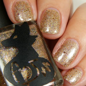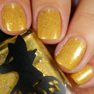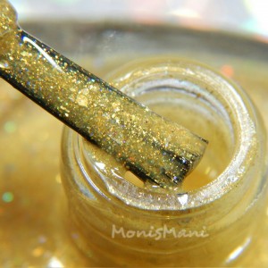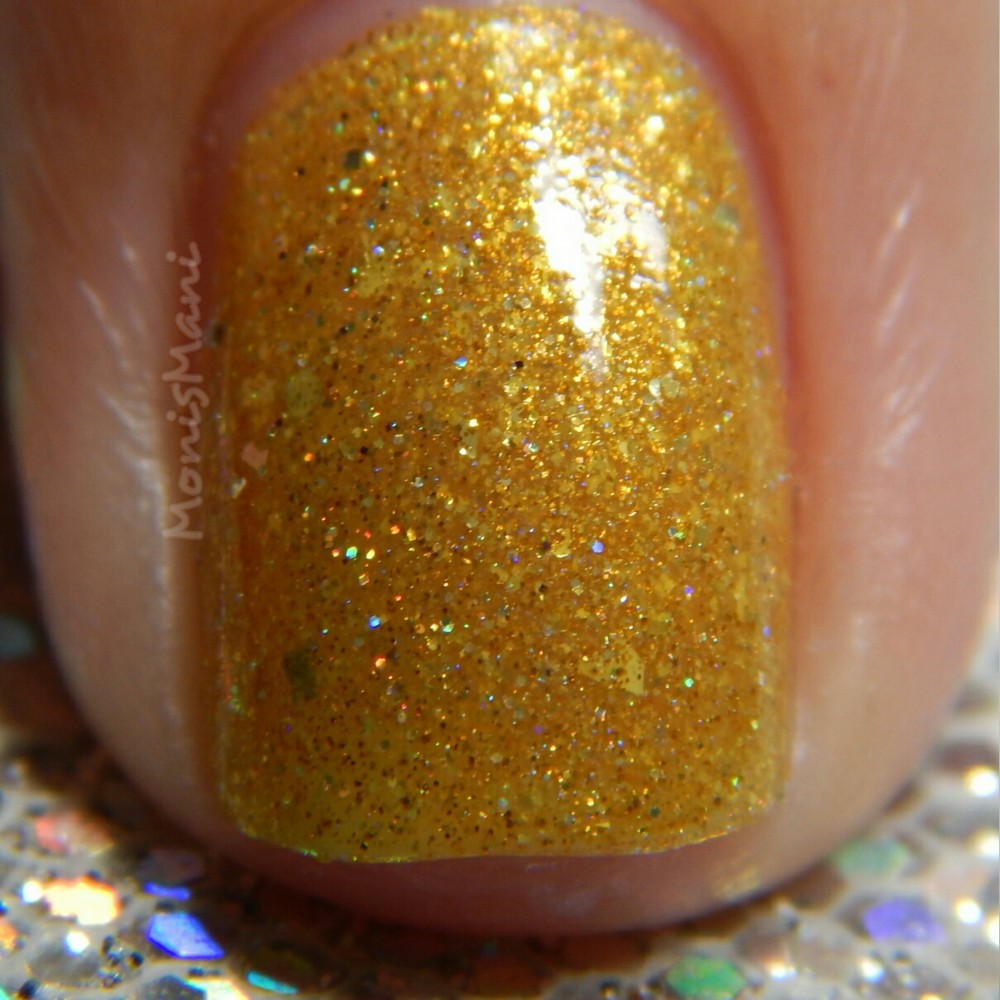 A surprisingly beautiful mustard yellow flakie filled crelly. This was a shock to me because I was ready to dislike it ( I tend to dislike these color polishes) but I really really love it on my nails! you see three thin coats plus top coat in the pics.