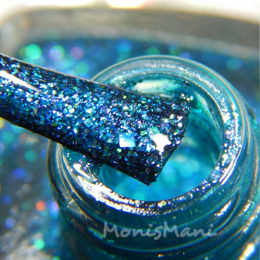 Blue jelly filled with micro holo glitter and flakies. 3 thin coats plus glossy and matte top coat in the pics
