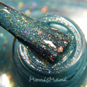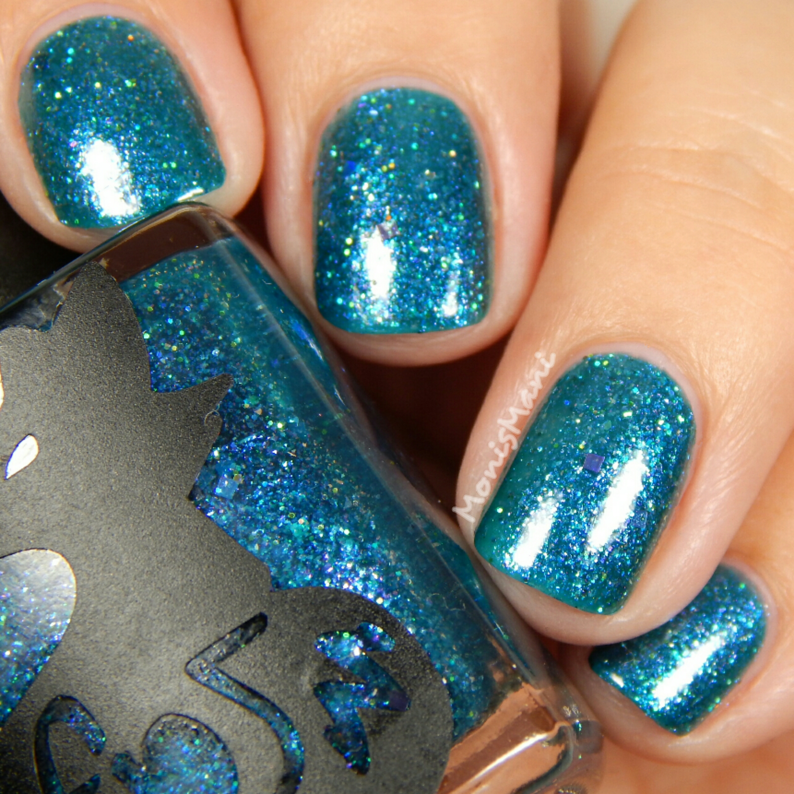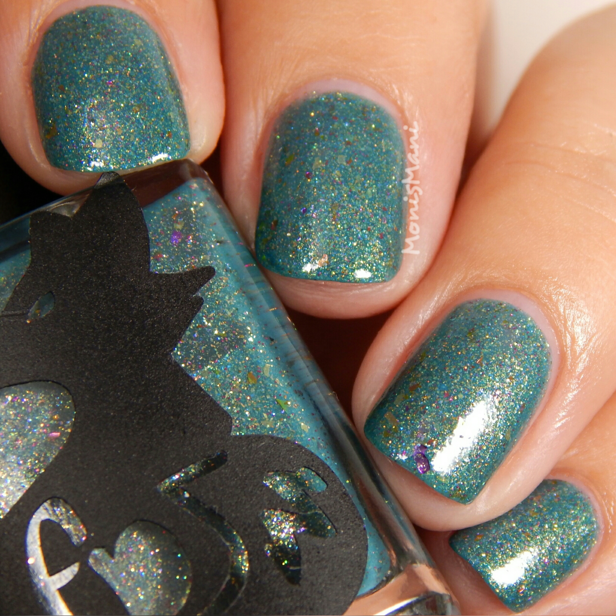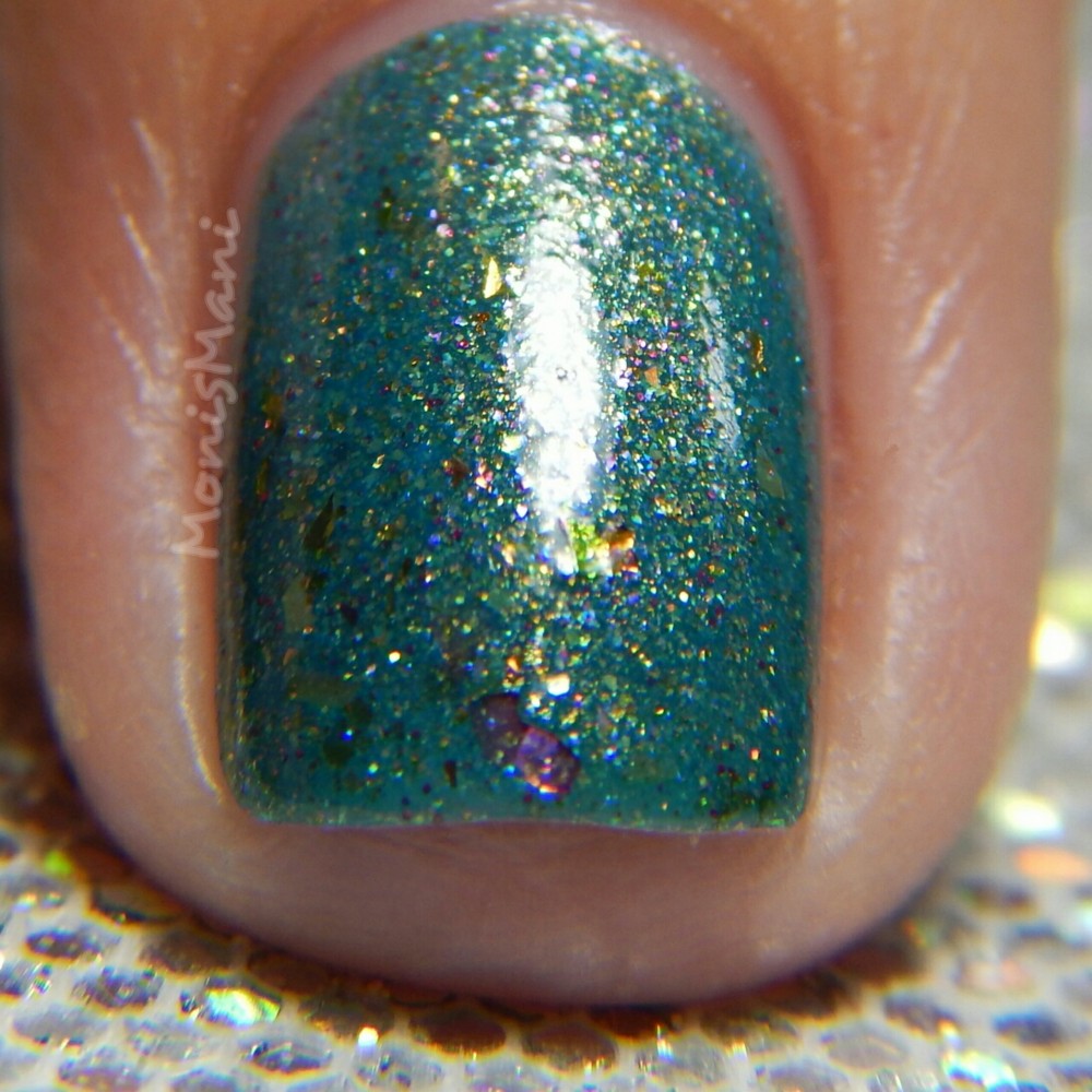 Teal crelly filled with micro and large flakes, absolutely beautiful. 2 coats plus glossy and matte top coats in the pics