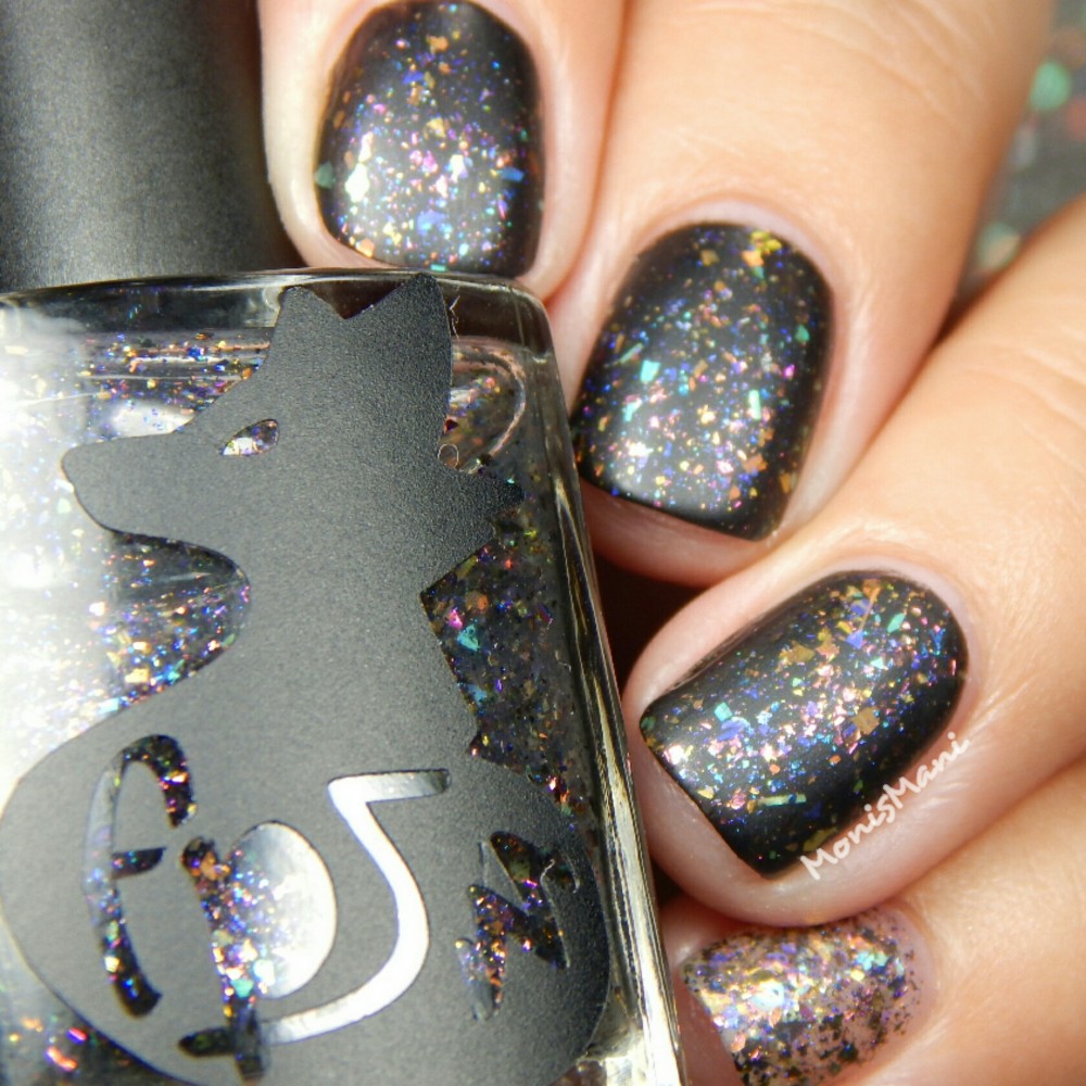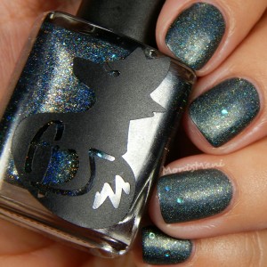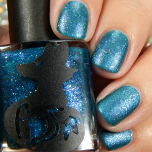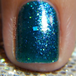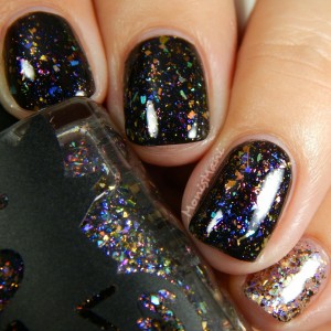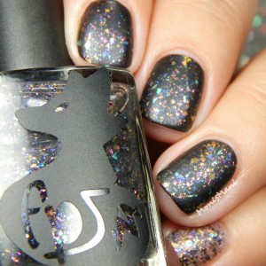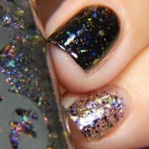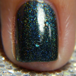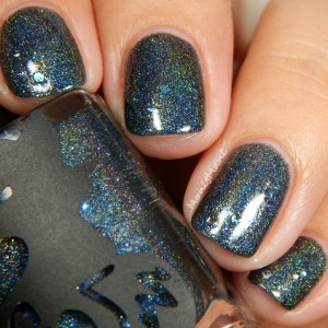 Black “in yo face” holo with beautiful blue flakies. This is crazy gorgeous, I always wondered what happened when you matted a holo and with this I realized that matting a holo is all sorts of amazing.. I had the absolute hardest time taking the macro of this because my camera just could NOT catch the beauty of the little flakies! 2 coats plus glossy and matte top coat in the pics.