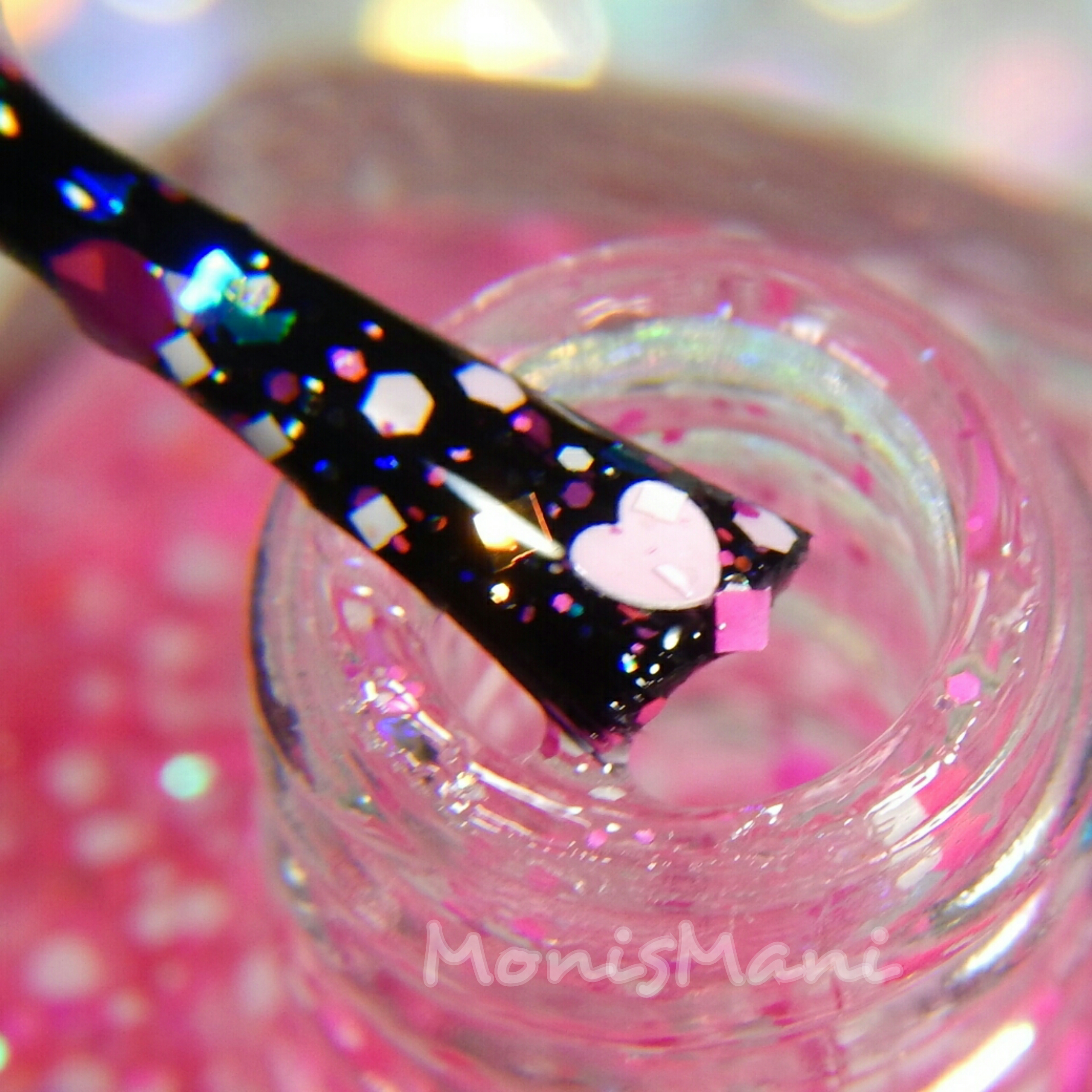 Named after the God of sexual desire and attraction (ouuu yeahh) is a super cute and bubbly glitter topper on clear base, filled with hot pink, pastel pink, gold glitters in different shapes and sizes, check out those adorable hearts! The formula is great, no goopyness or need for fishing. I did one coat of Eros plus one coat of glossy top coat over Erida for the picture below.