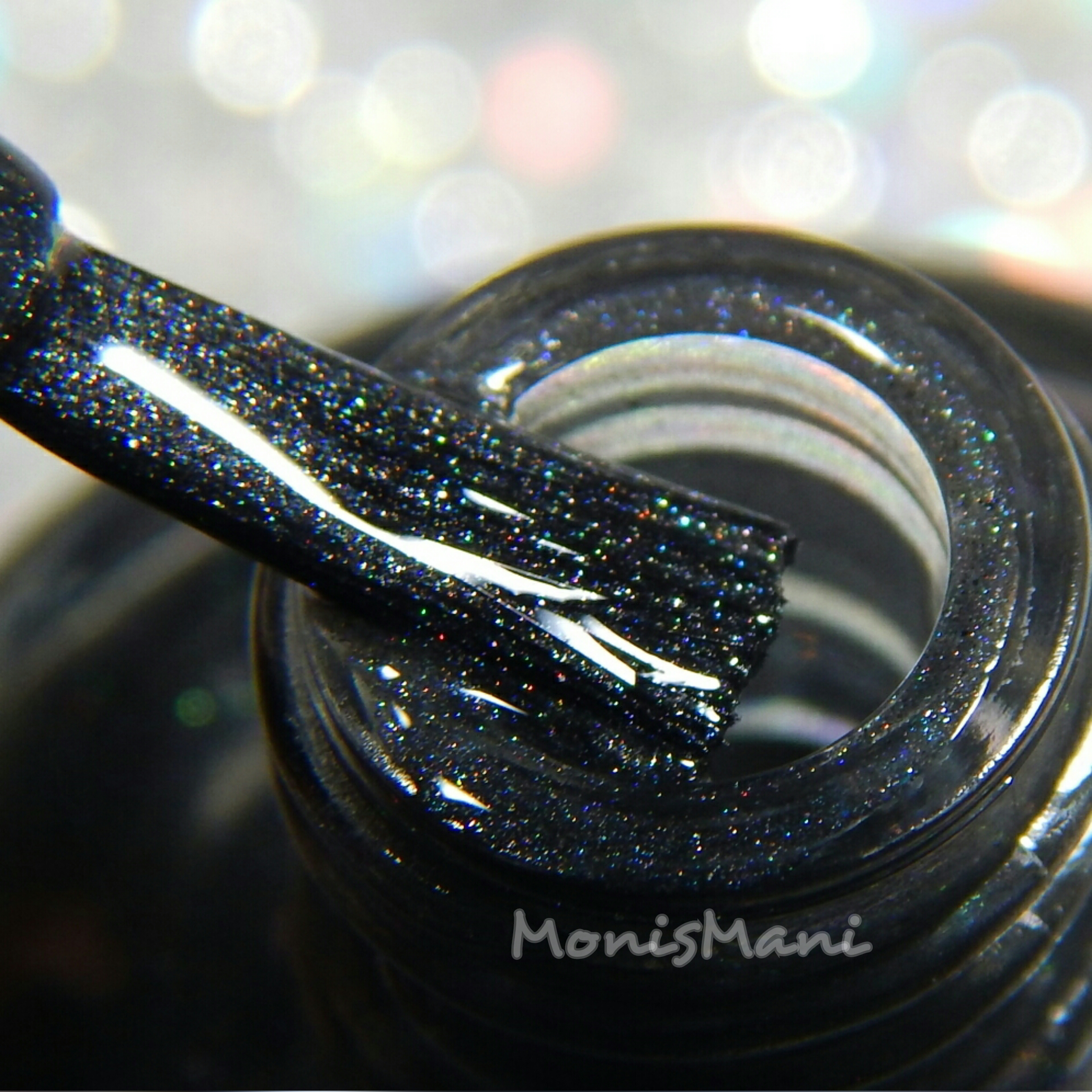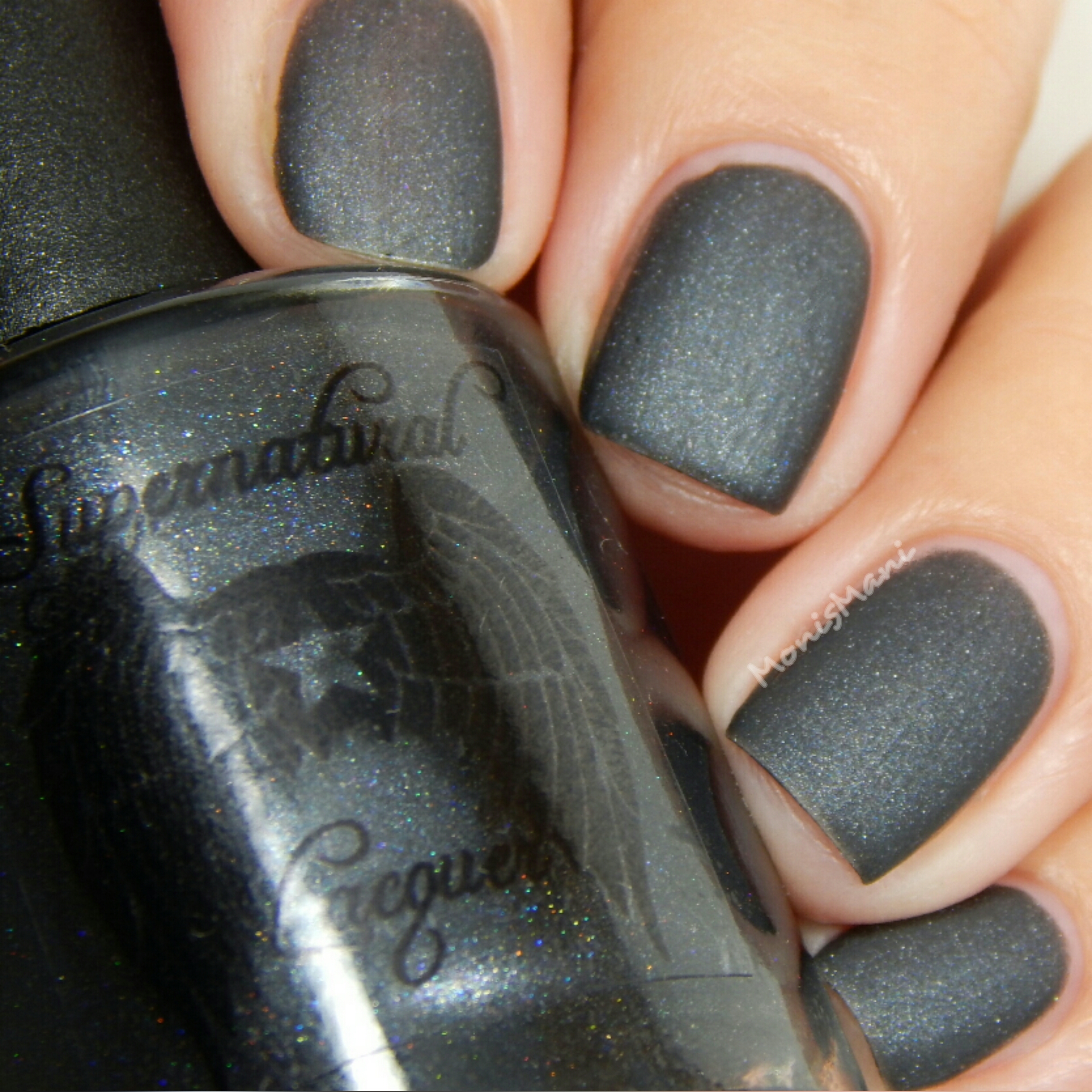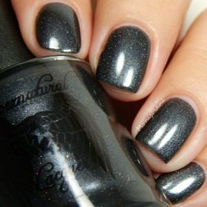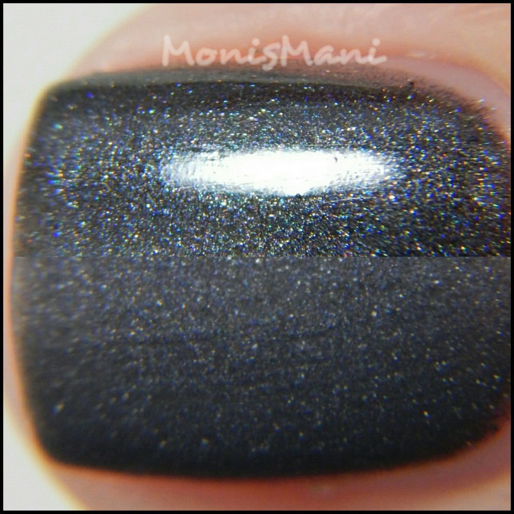Named after the goddess of hate is a gun-metal black with softly scattered holo. I really loved the formula on this, dried quickly and very easy to work with. I did three thin coats (but two would be good as well) plus glossy and matte top coat in the pics.