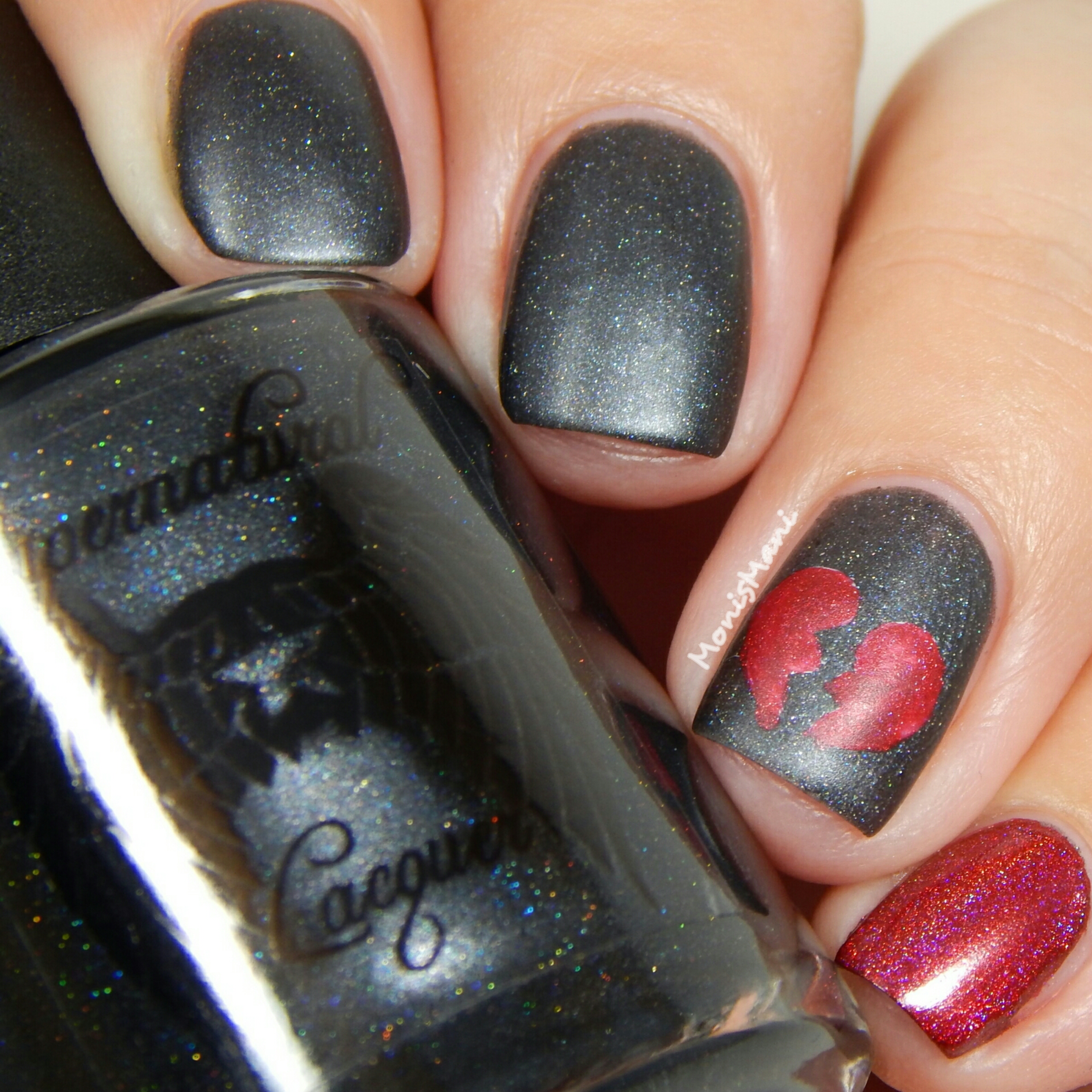 For nail art I of course attempted a freehand broken heart. Accent finger and heart are my all time fav red, Wrath by Anonymous Lacquer
