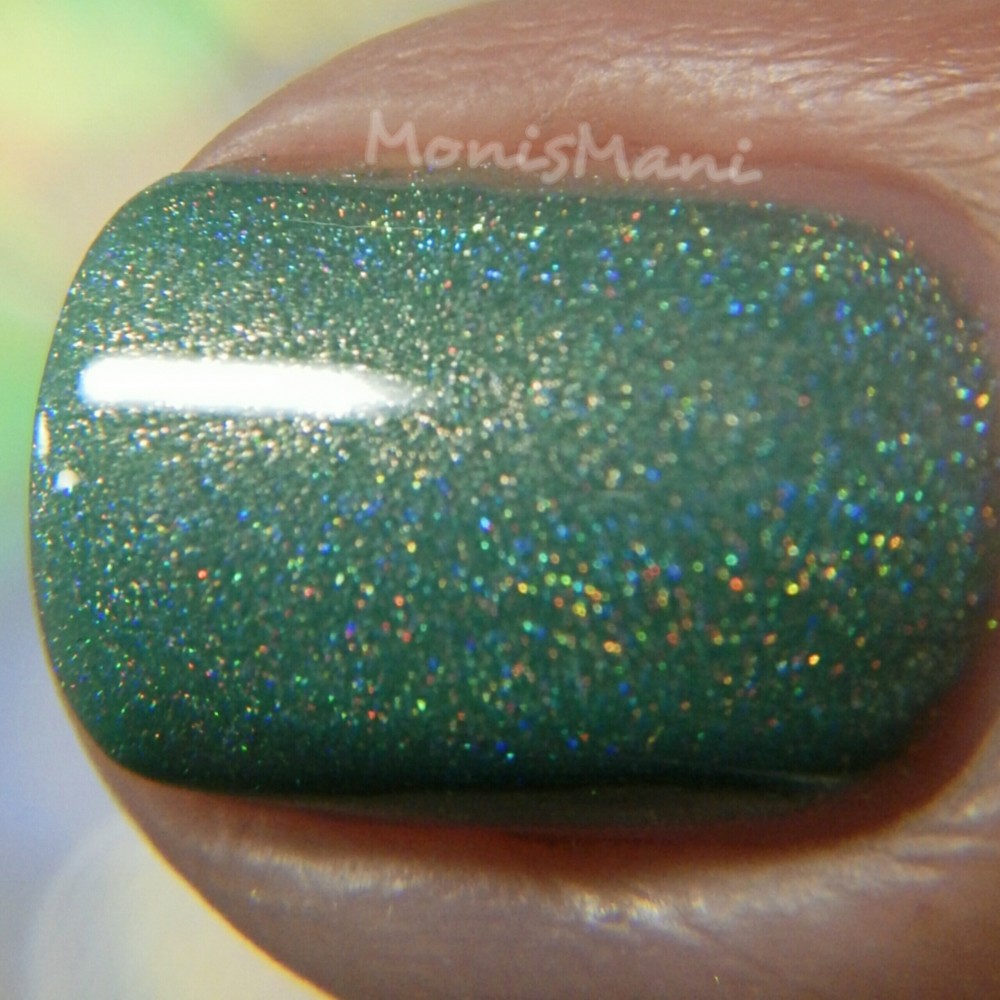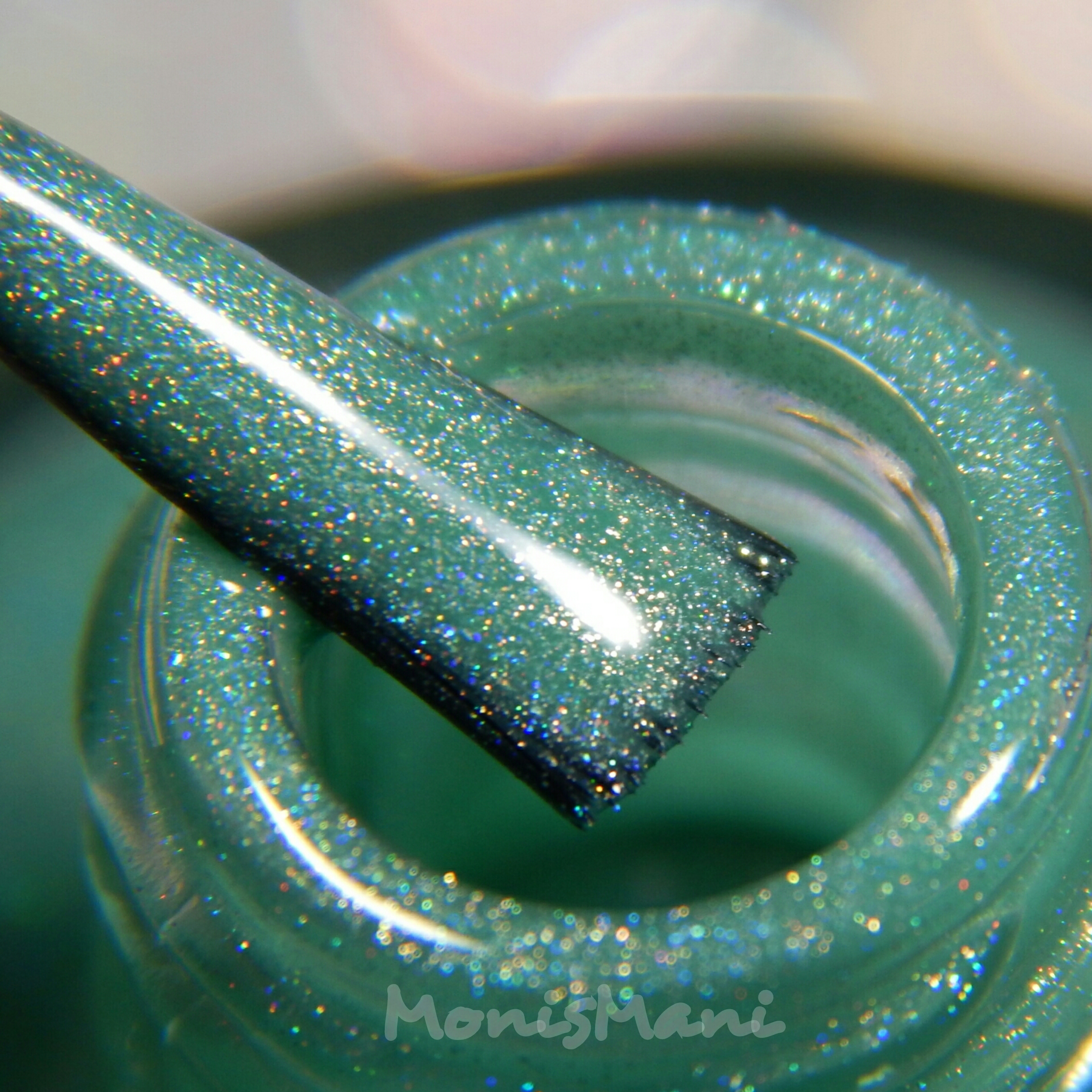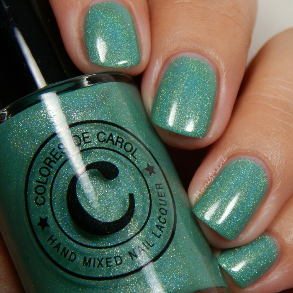Is a beautiful sea-foam holo that is just too gorgeous for words!! Love that Carolina included a non traditional valentine color in this mini collection. This sea-foam is out of this world! Two coats plus glossy top coat in the pics.