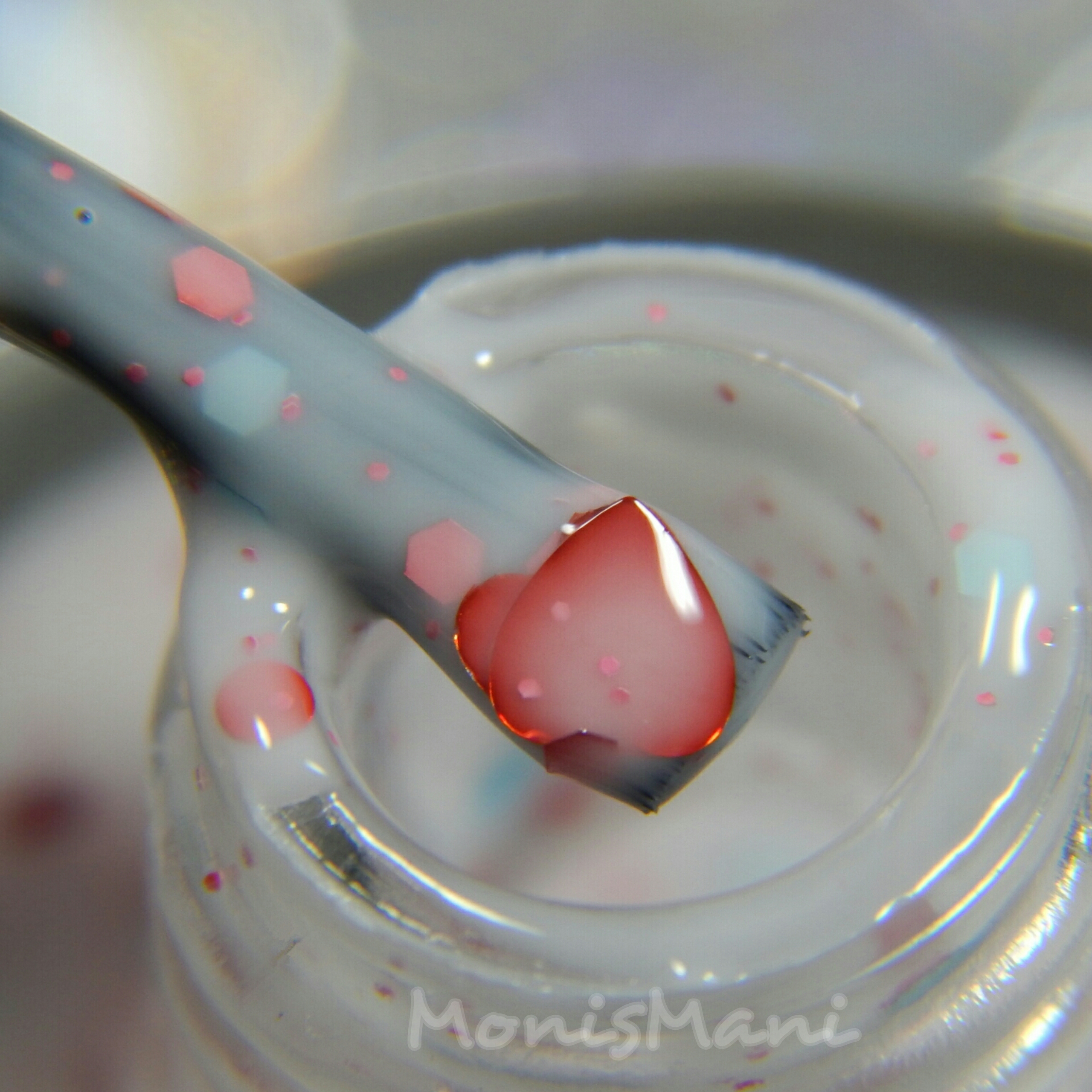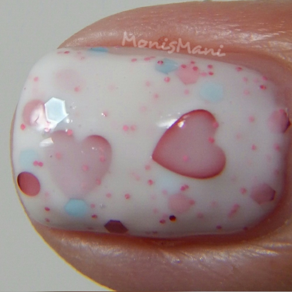 A cute white crellie filled with pink and blue glitters in different shapes and sizes and beautiful large red heart glitters. So adorable! There is no need for fishing at all with this baby, the hearts are super easy to come by! You see three thin coats plus glossy top coat for the pics.