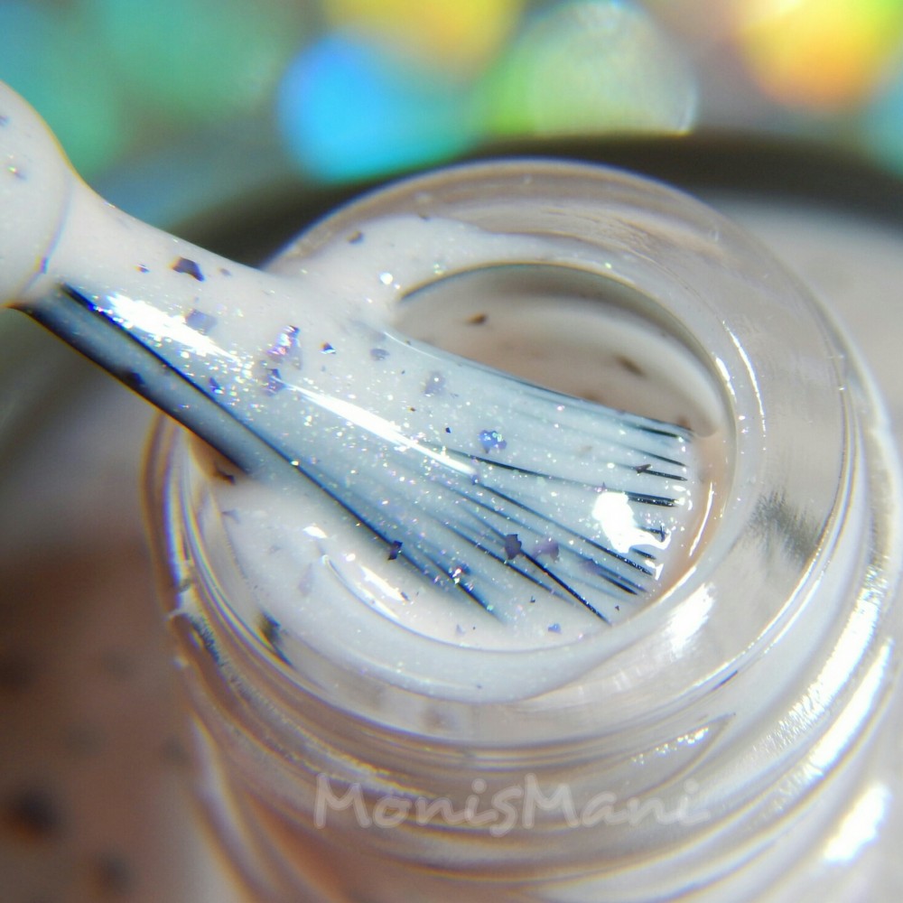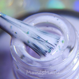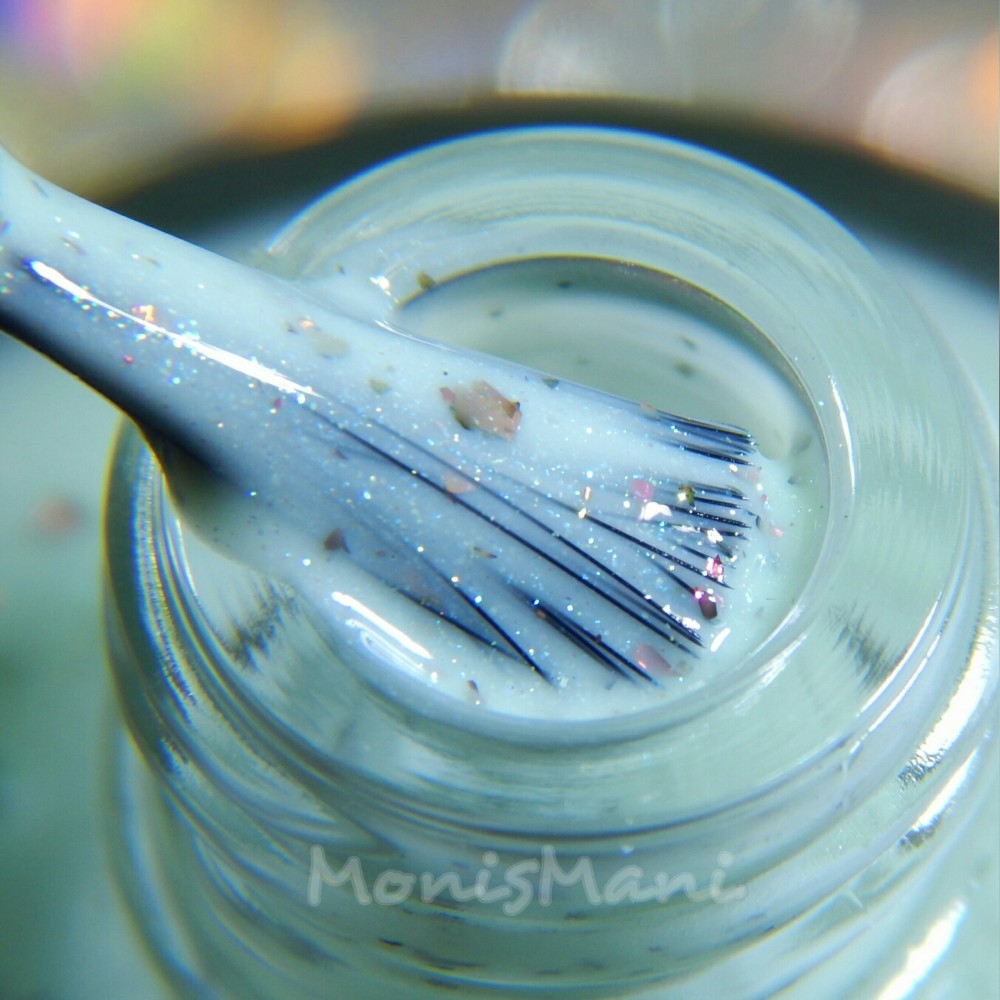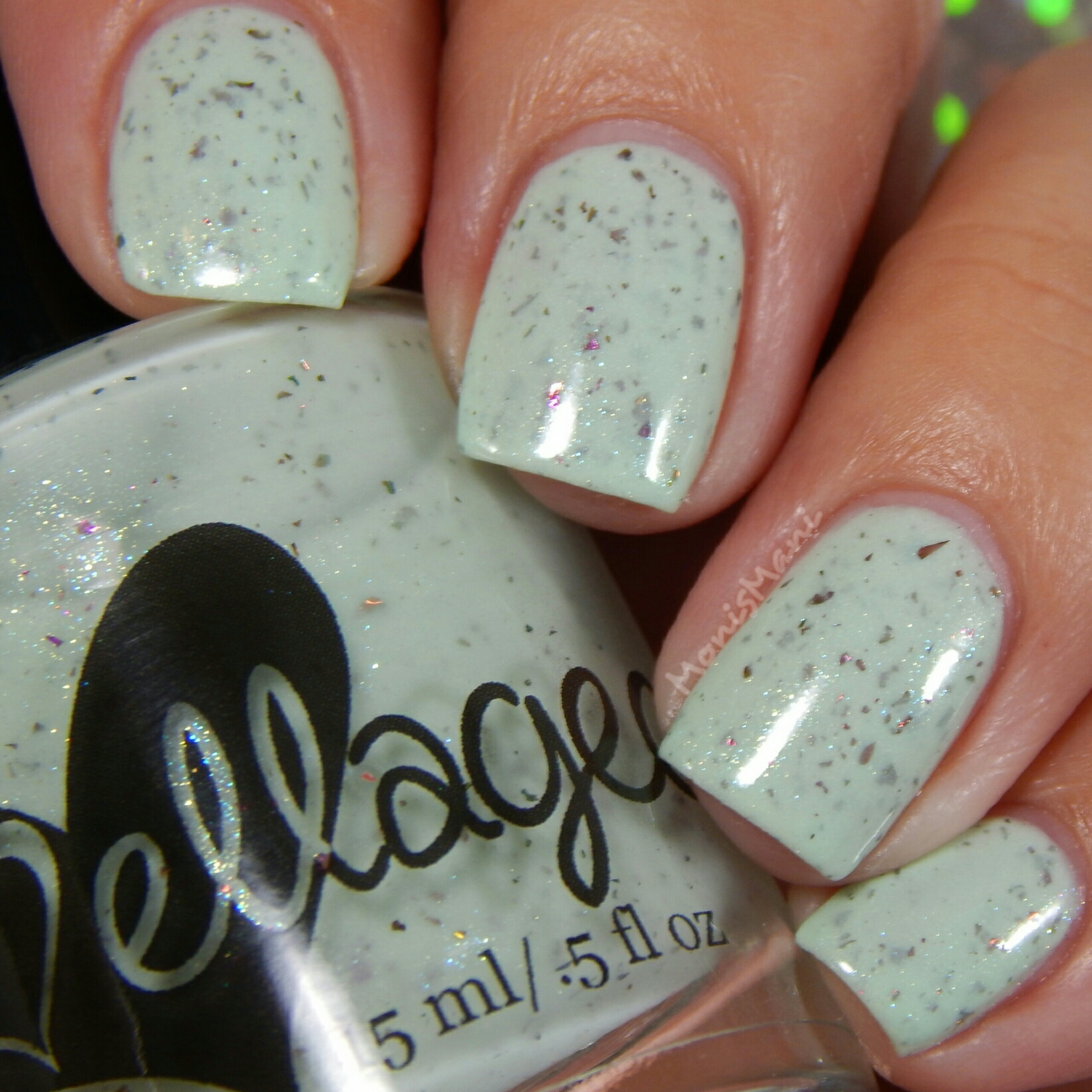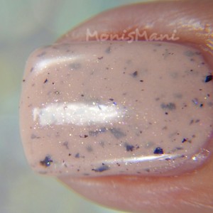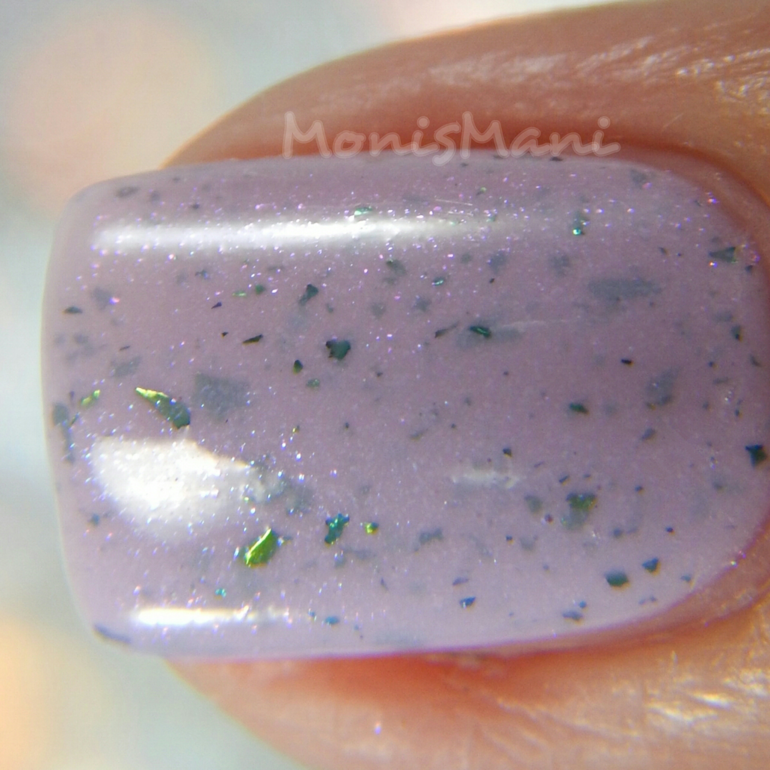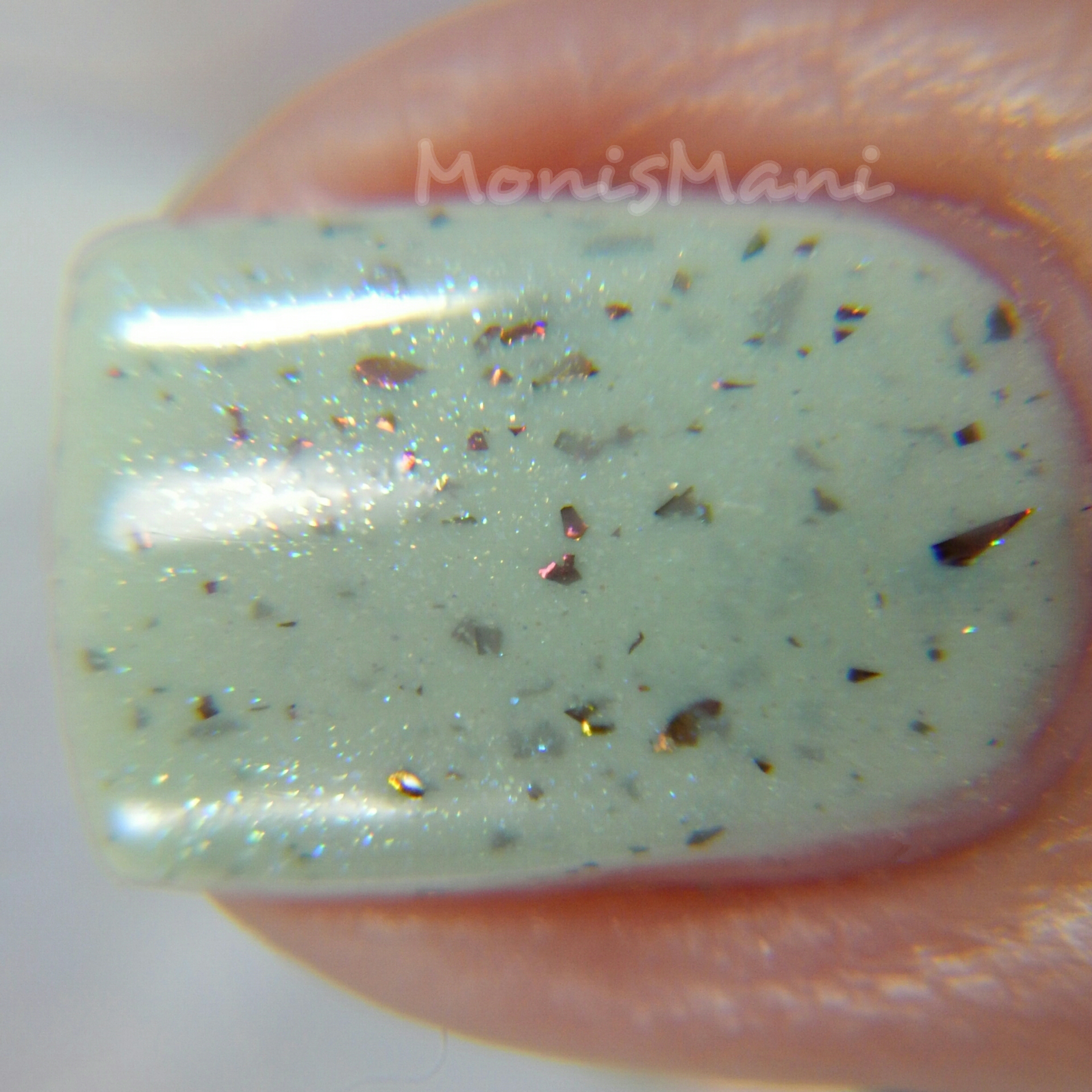 Is a shimmery pastel mint with copper/fuchsia flakies. You see three super thin coats plus glossy top coat in the pics. I think you would be ok with 2 depending on what kind of polisher you are.