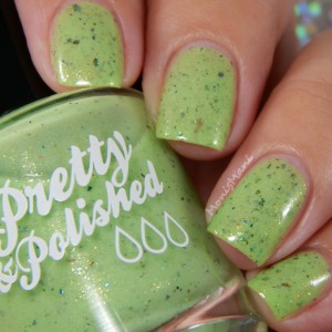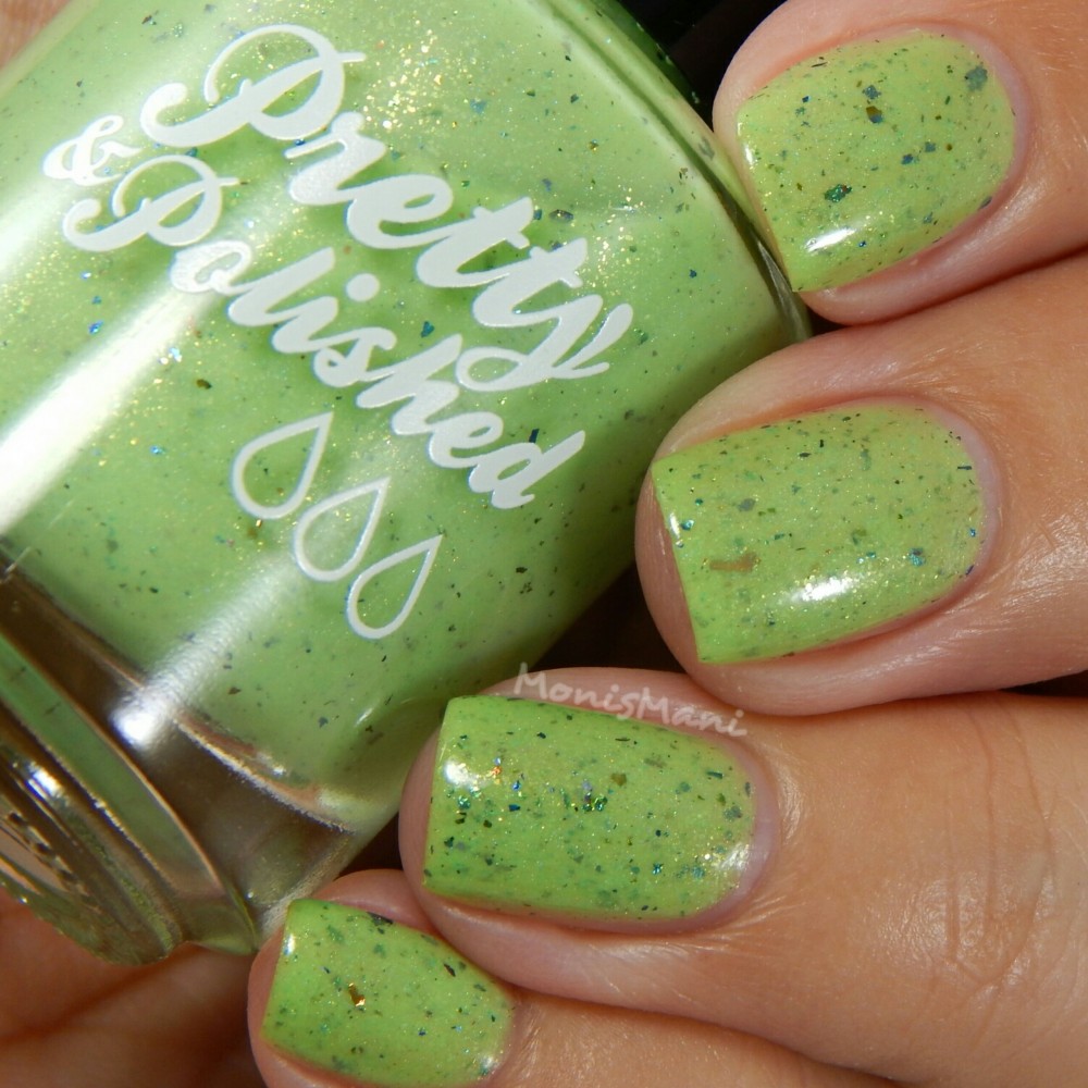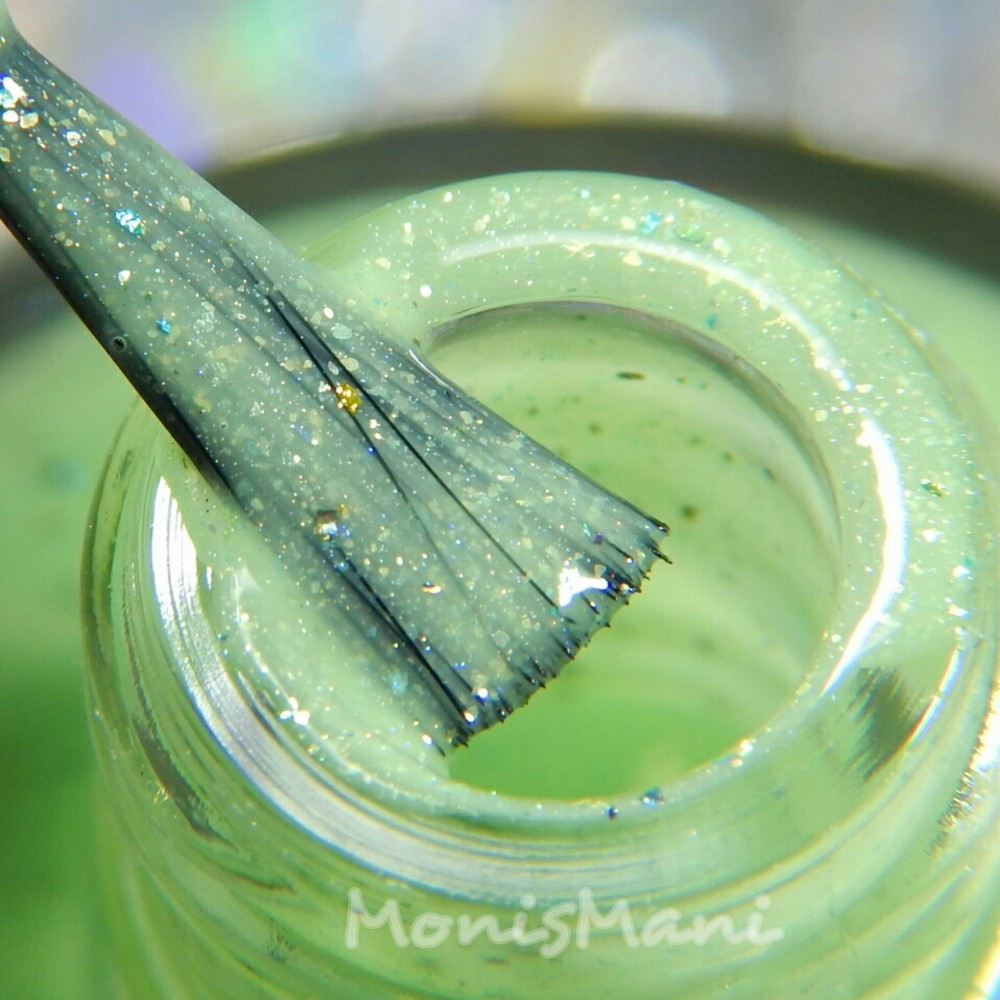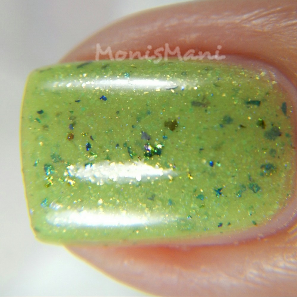 Is a beautiful spring green packed with pale green flakes and multichrome flakes. The formula on this guy was a bit thin but the color payoff is beautiful. I did three coats plus glossy top coat for the swatches.