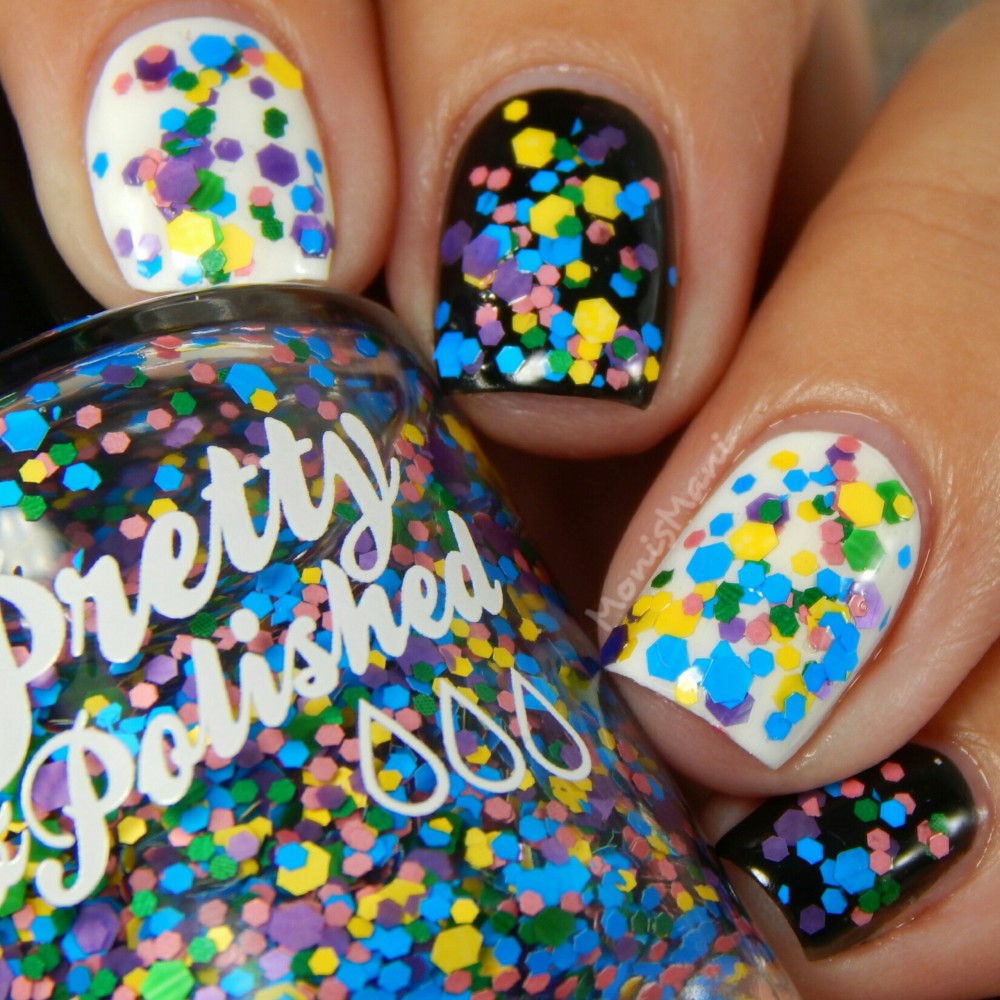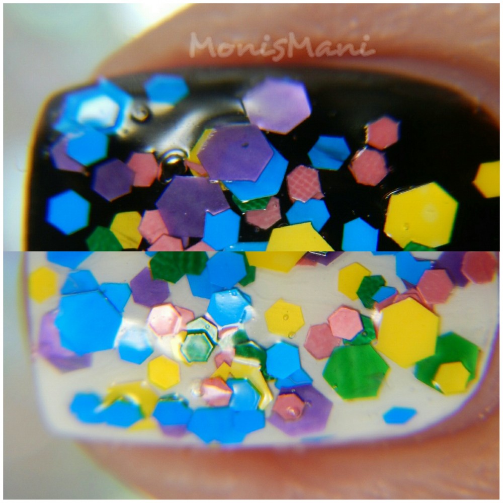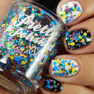 As it should be of course with such a name, this happy and colorful glitter medley on clear base is celebration in a bottle! I did one coat of this bright topper over black and white, topped with one coat of glossy top coat.