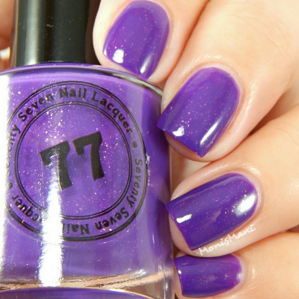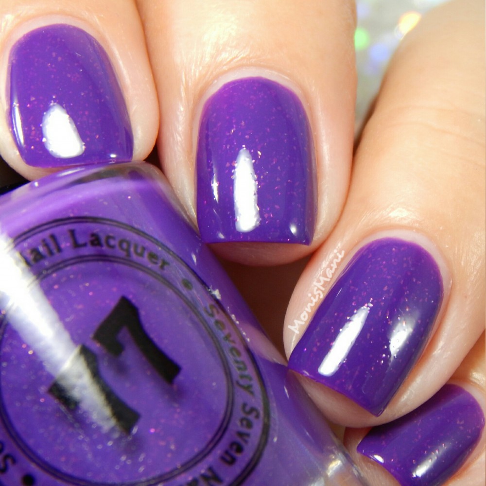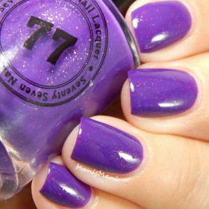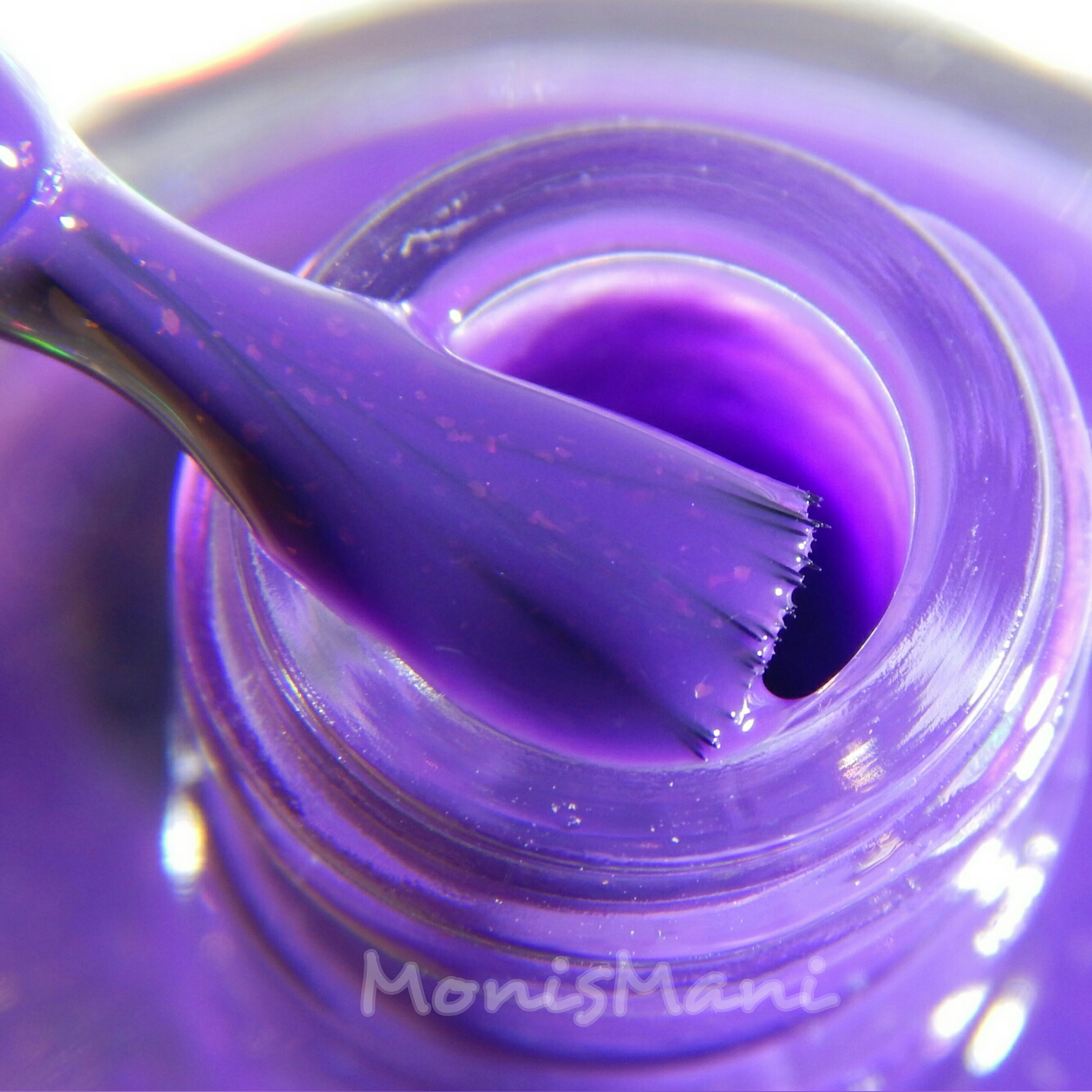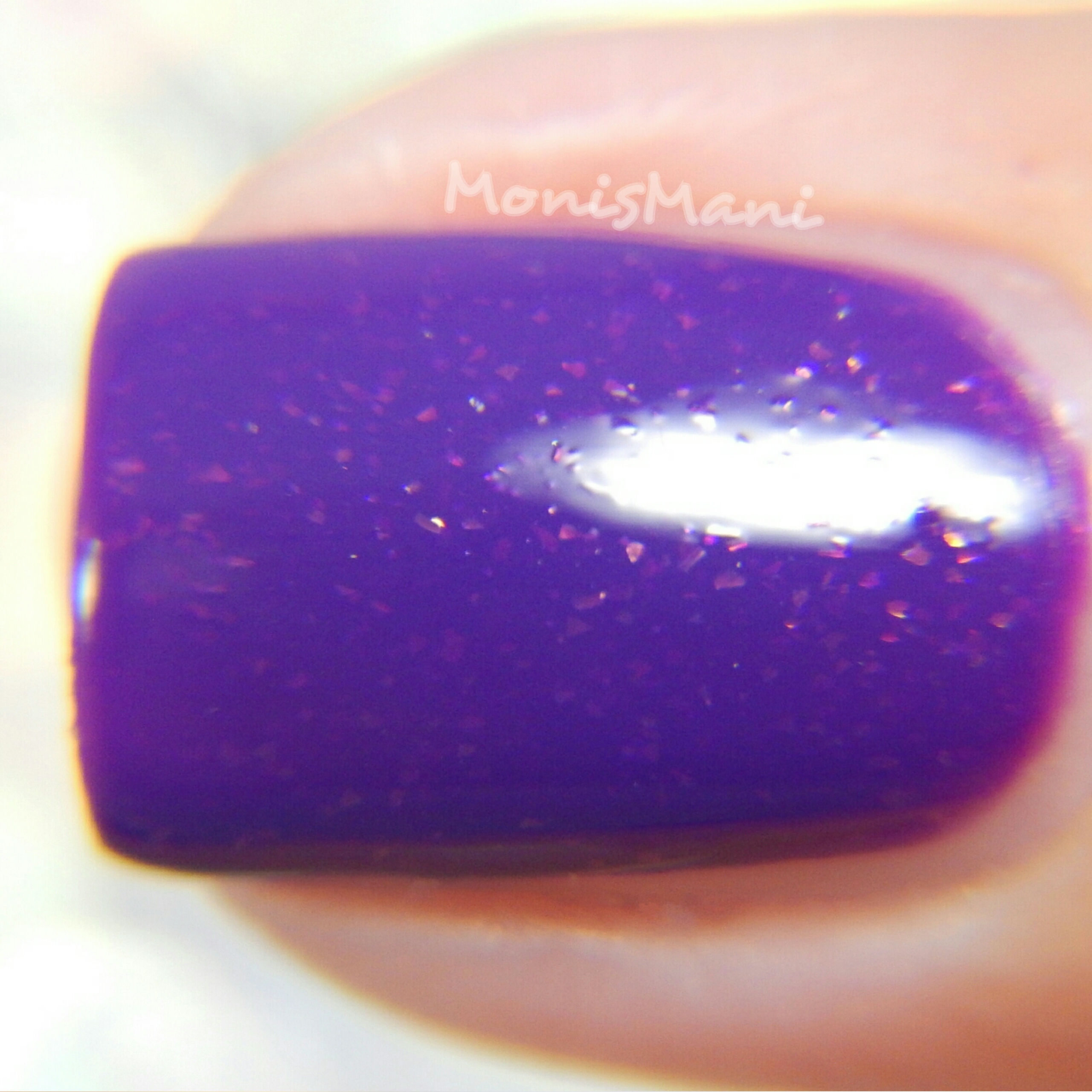 Is a pretty purple cream filled with shifting flakies. I really love this color! the formula was a tiny bit tricky but good. I did three thin coats plus top coat plus glossy top coat in the pics.