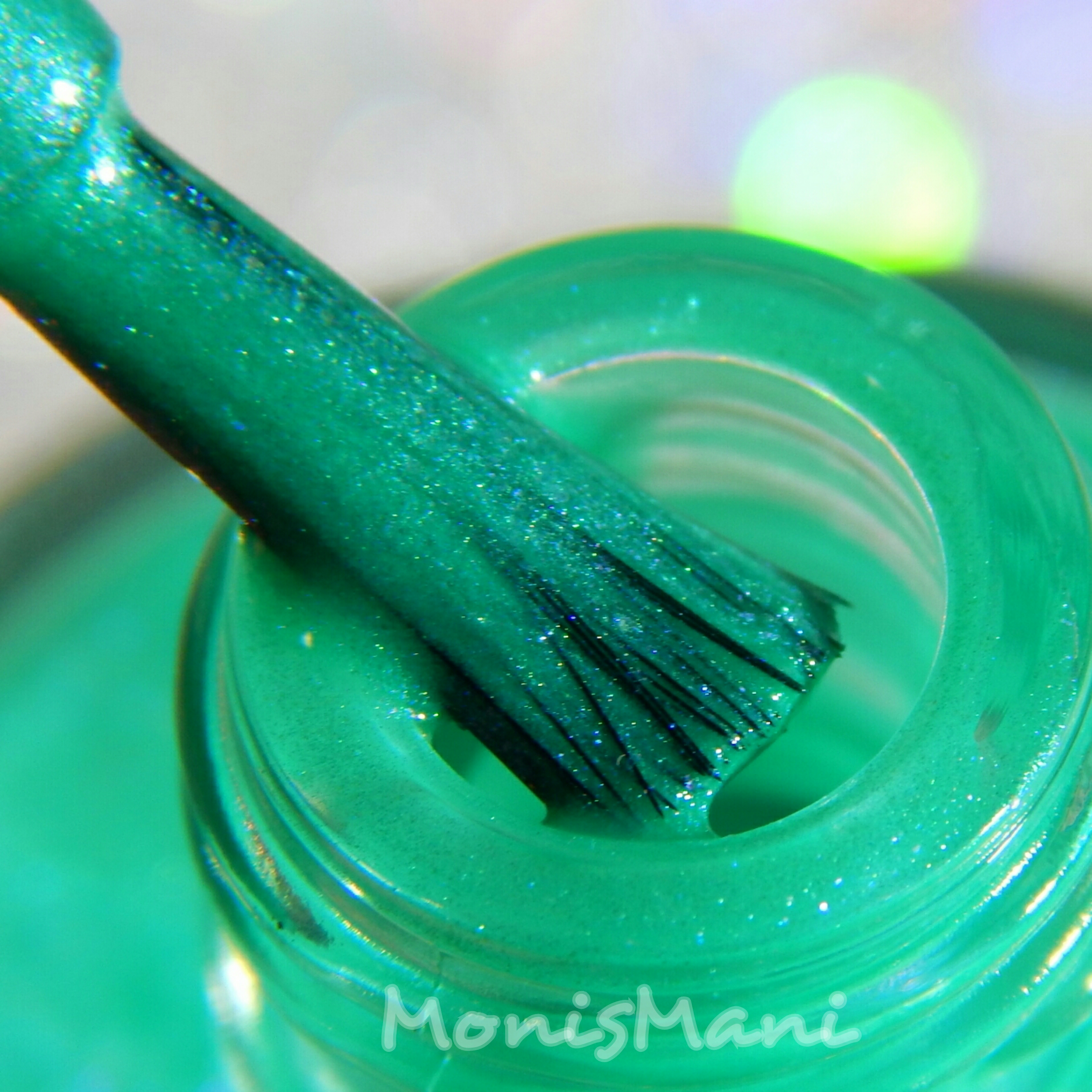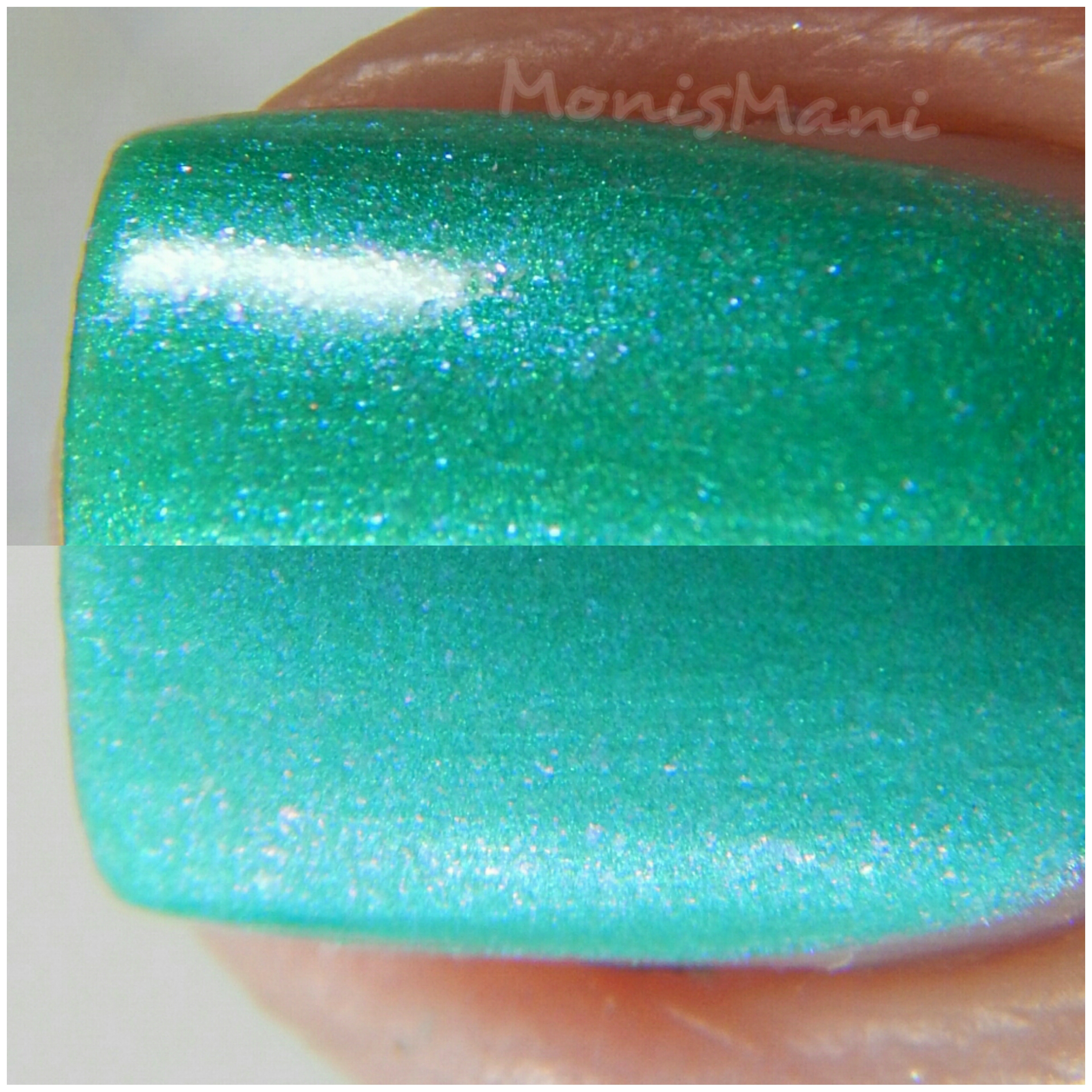 Is a gawgeous green creme with blue shimmer, I also love this baby! The formula was great! two coats plus top coat and fast drying. Perfect!!