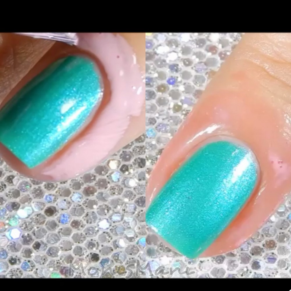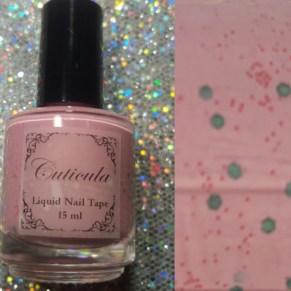 Pink nail tape filled with tiny pink matte  and big blue hex glitters. Goes from a ballet slipper pink when applied to a rouge pink when dry. The strawberry scent doesn’t hit you right when you open the bottle but you definitely don’t get that strong icky fish smell when you open the bottle either (which is much appreciated). The strawberry scent becomes more noticeable as it dries.