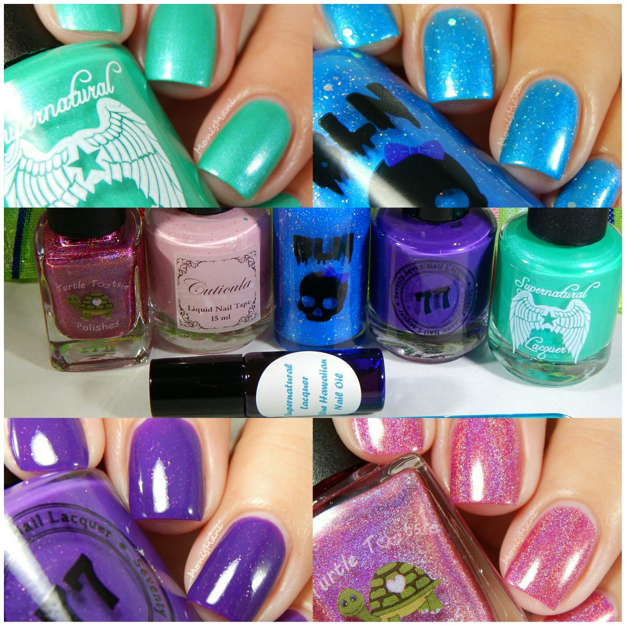 This box includes polishes from Turtle Tootsie Polish, Black Label Nails, Supernatural Lacquer, 77 Nail Lacquer, glass nail file, mini cuticle oil, nail tape by Cuticula, toe separators, some water decals and a cute tote to carry it all in. Let’s take a look at everything one by one!