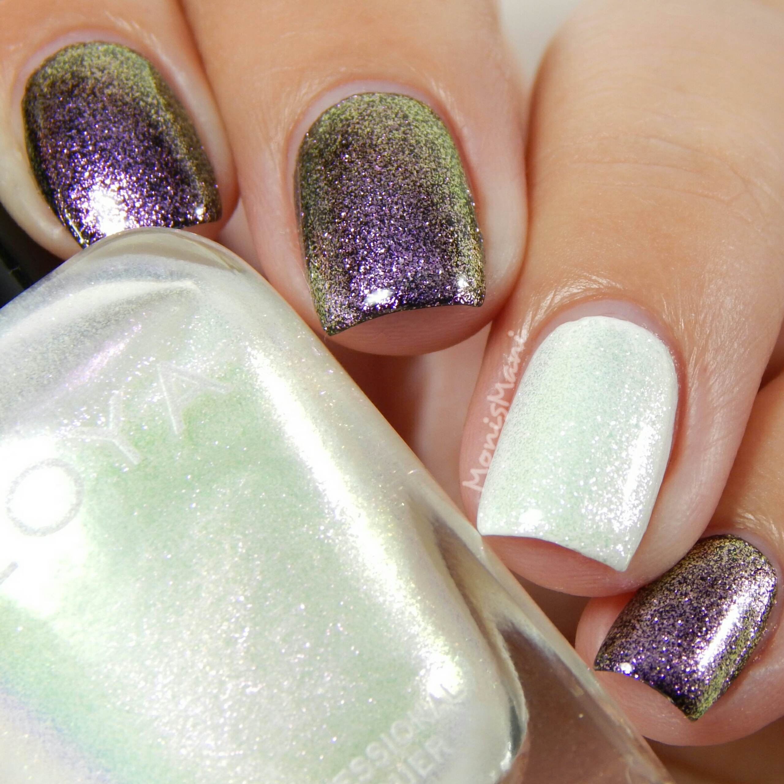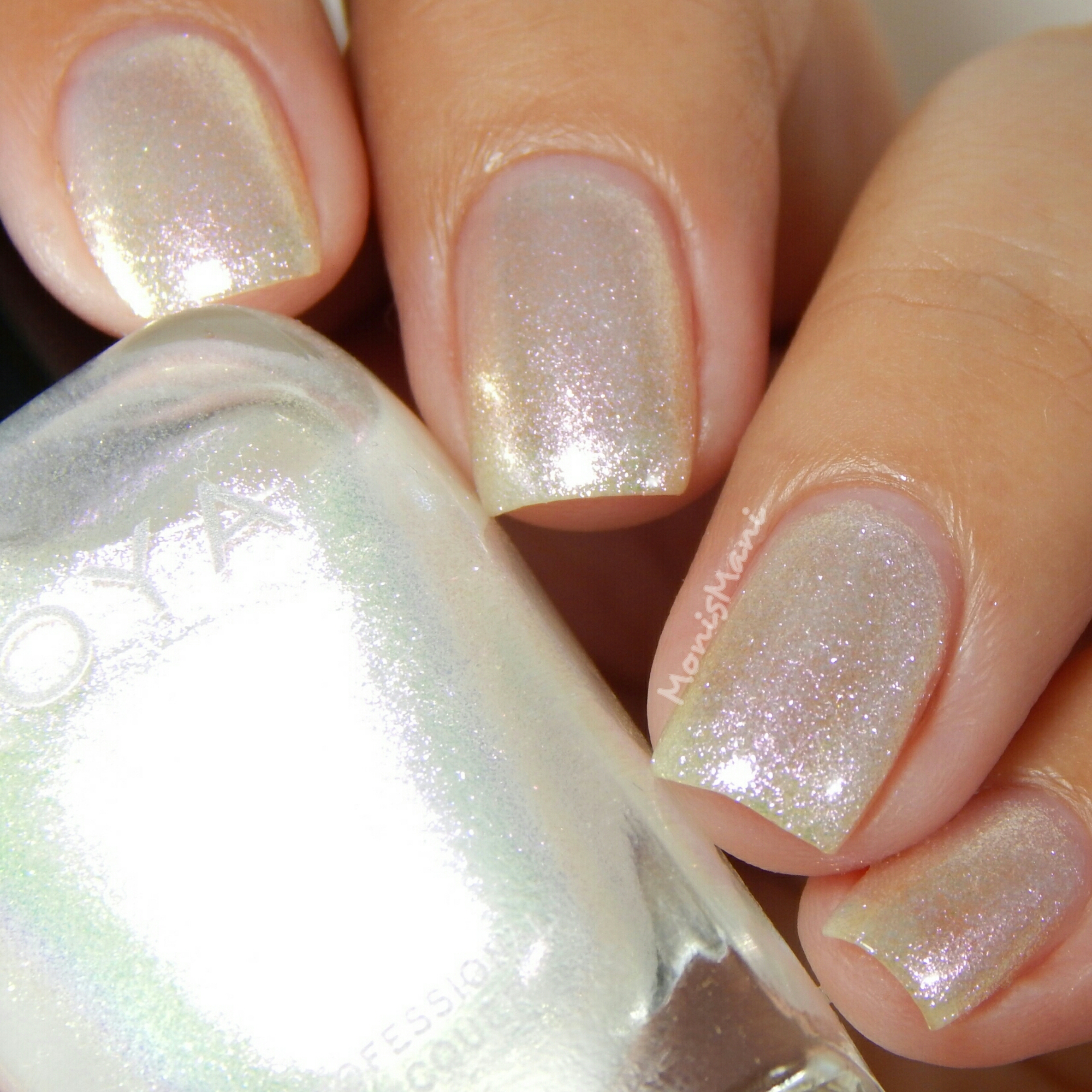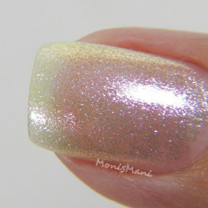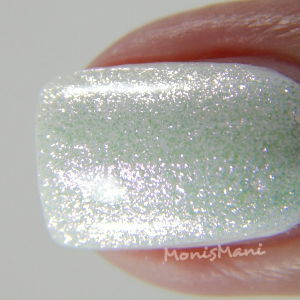 Described by the maker as “a sheer, opalescent white with flecks of fuchsia, green and gold. Just as beautiful on its own or layered over your favorite spring shades!” you see three coats plus top coats on it’s own and one coat over black and white.