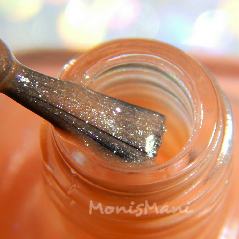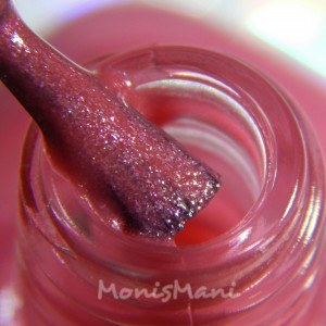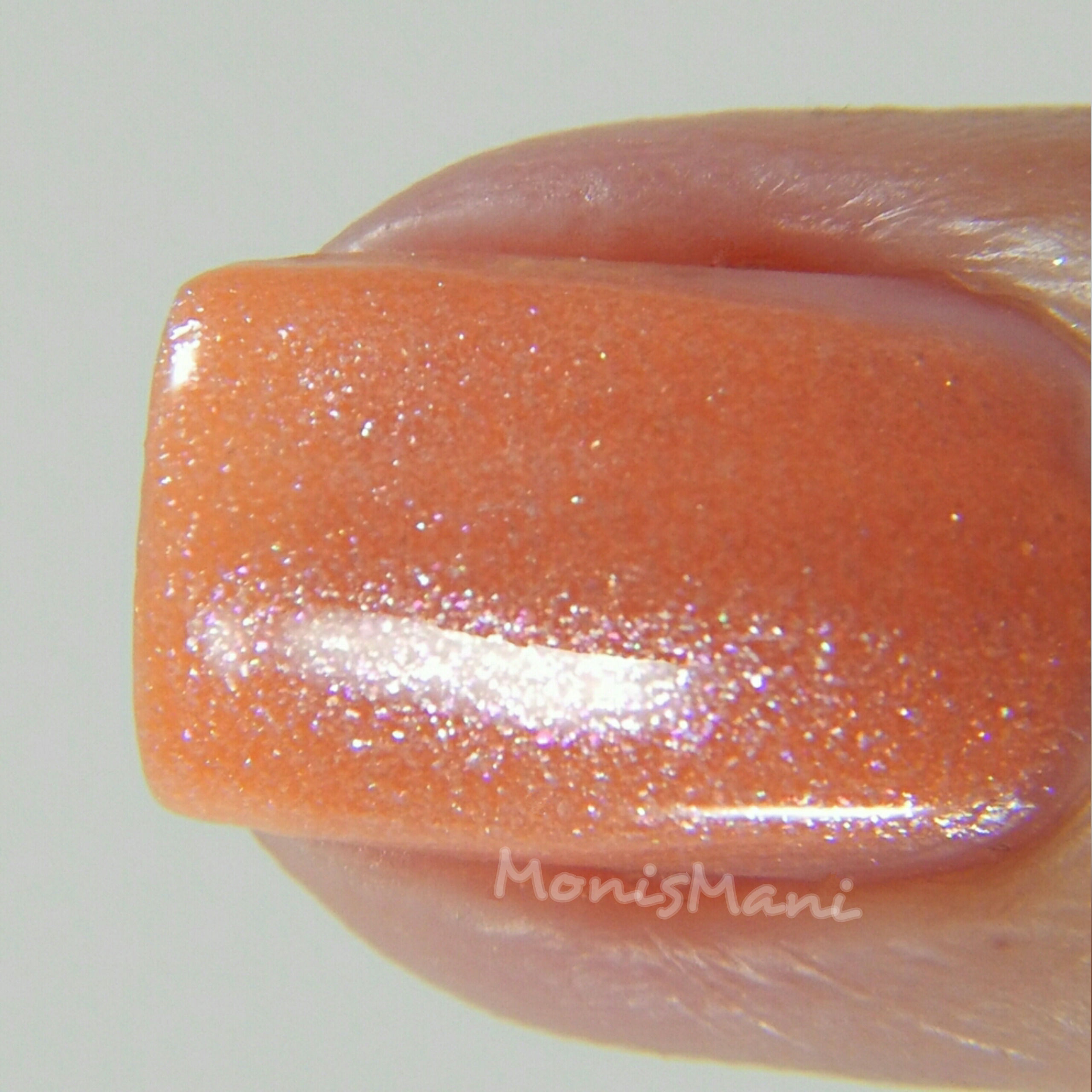 Described by the maker as “a brilliant shimmering coral made modern with an opalescent effect”. You see three thin coats plus top coat in the pics