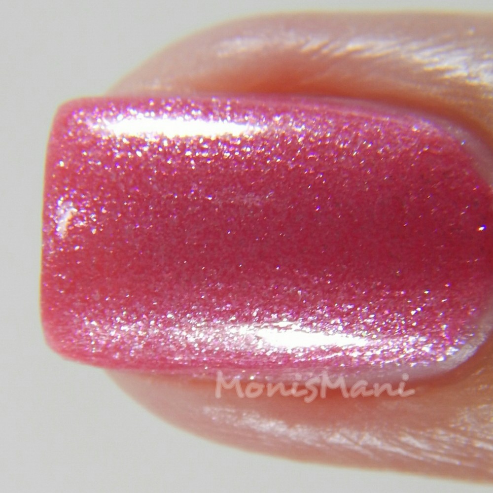 Described by the maker as “a classic spring pink with a captivating white and fuchsia flash”. You see three thin coats plus glossy top coat in the pics.