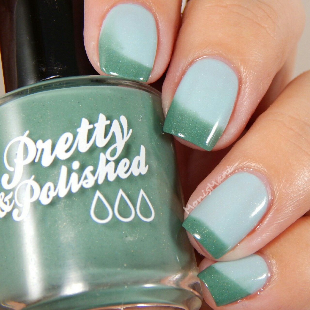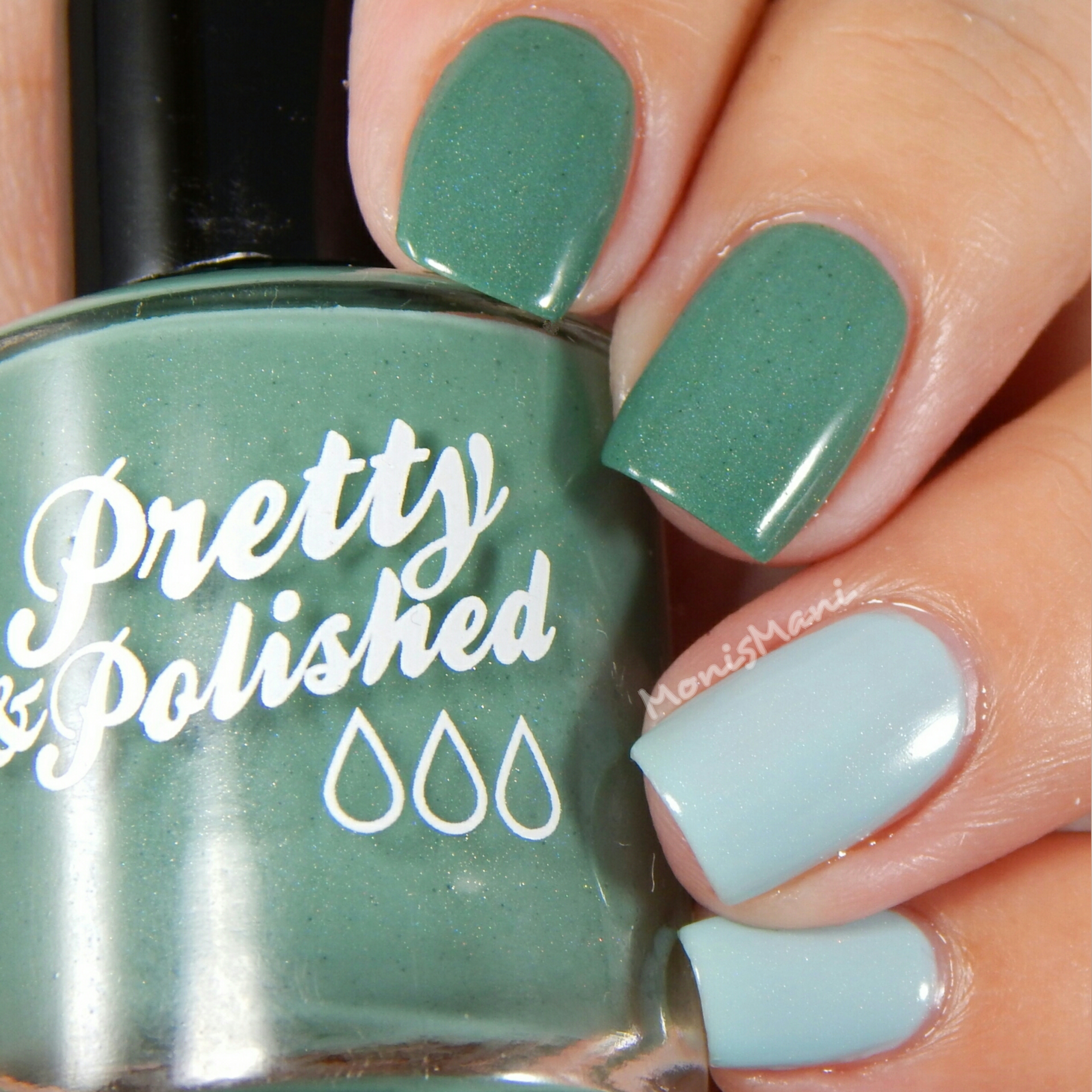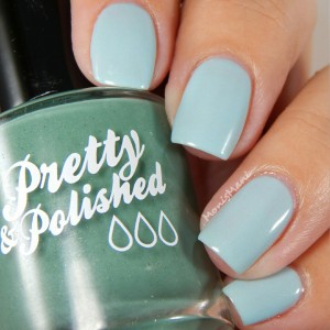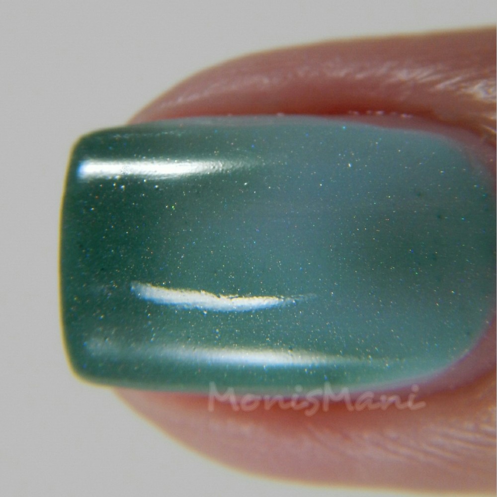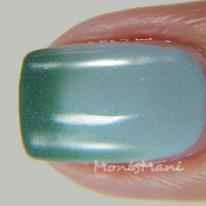 Tomboyish goes from a creamy teal green when cold to a light blue (almost grey) when warm with a subtle holographic touch.