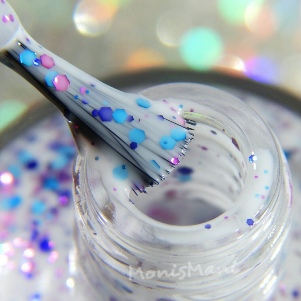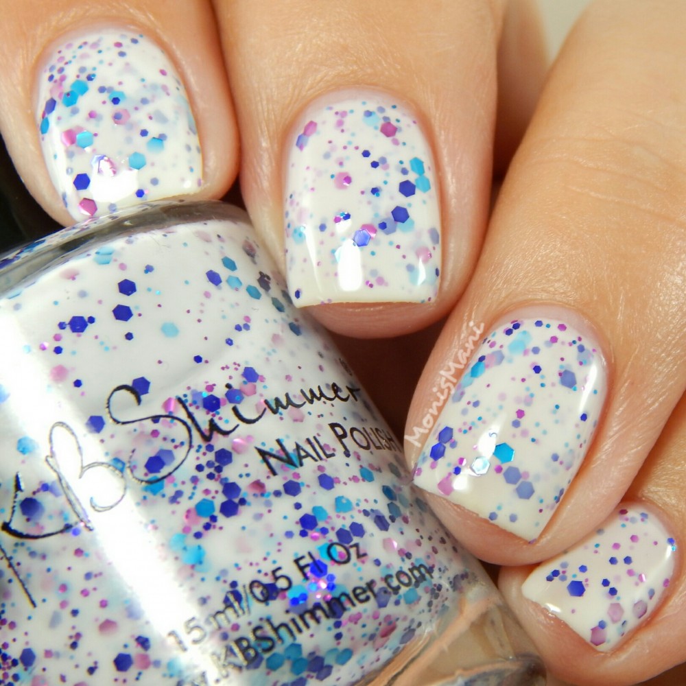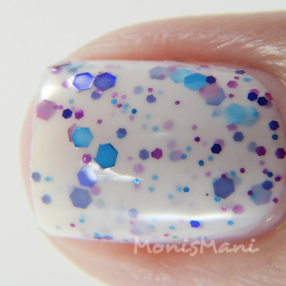 Is a white crelly filled with fun glitter in fuchsia, turquoise, and sapphire. Asbolutely adorable! The formula is great, easy to apply, no need for glitter fishing or placement, glitters flow through naturally and easy on the nail.  I did three thin coats plus glossy top coat for the pics. love it!
