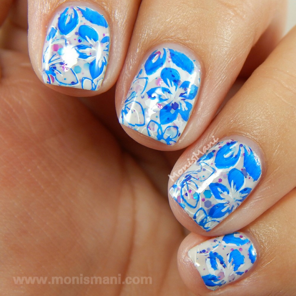 For nail art I decided to do some double stamping first in white then in blue with the help of a clear head stamper. Image is  from MoYou Nails plate 124. Hope you like it!
