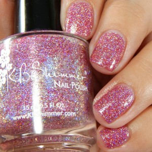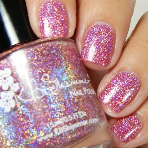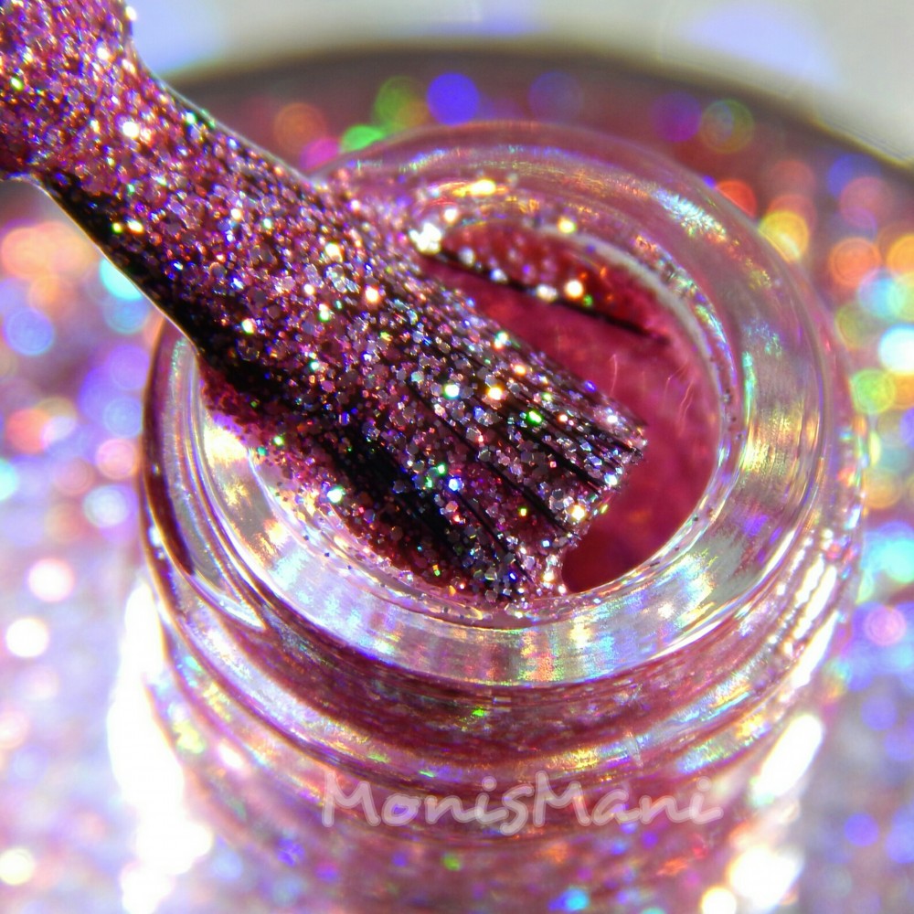 Is a soft raspberry “mega fame glitter polish” love that description (from the maker) . Seriously it could not be described more perfectly. This is totally in your face holo glitter with great coverage, formula is easy peasy and  two coats are all that’s needed for opacity. Dries slightly griddy but I needed only one coat of tc to smooth it out.  You see two coats plus glossy top coat in the pics.