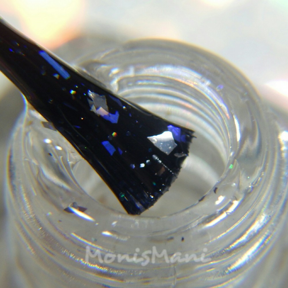 A clear based topper with silver holographic glitter, silver metallic flakes, iridescent purple flakes, and iridescent blue/purple micro glitter. Those large iridescent purple flakes are just gorgeous!! you see one coat over you’re so vein in the pics.