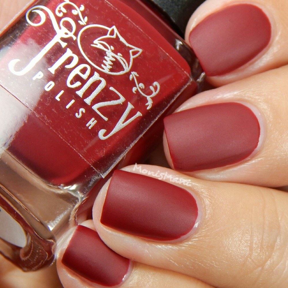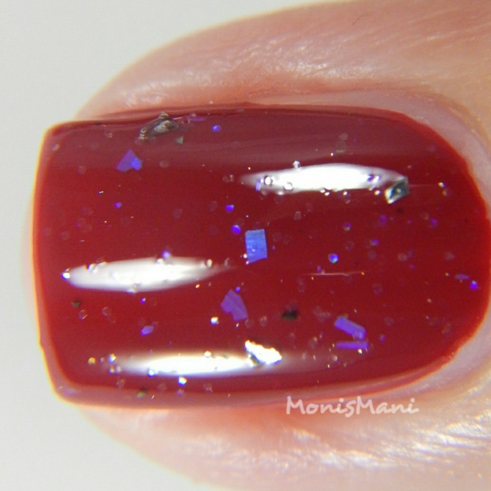 Is a pretty blood-red creme with perfectly flowy formula. You see two coats plus glossy top coat in the first two pics, and then topped with a matte top coat in the third.
