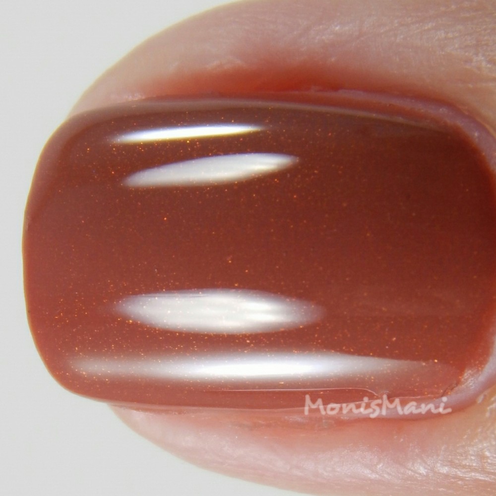 Is a creamy rust with a hint of pink and a subtle gold twinkle. The formula is spectacular, two smooth coats for coverage and glossy top coat for the pics.