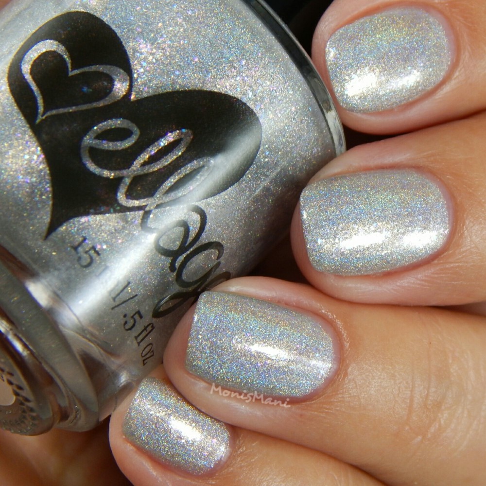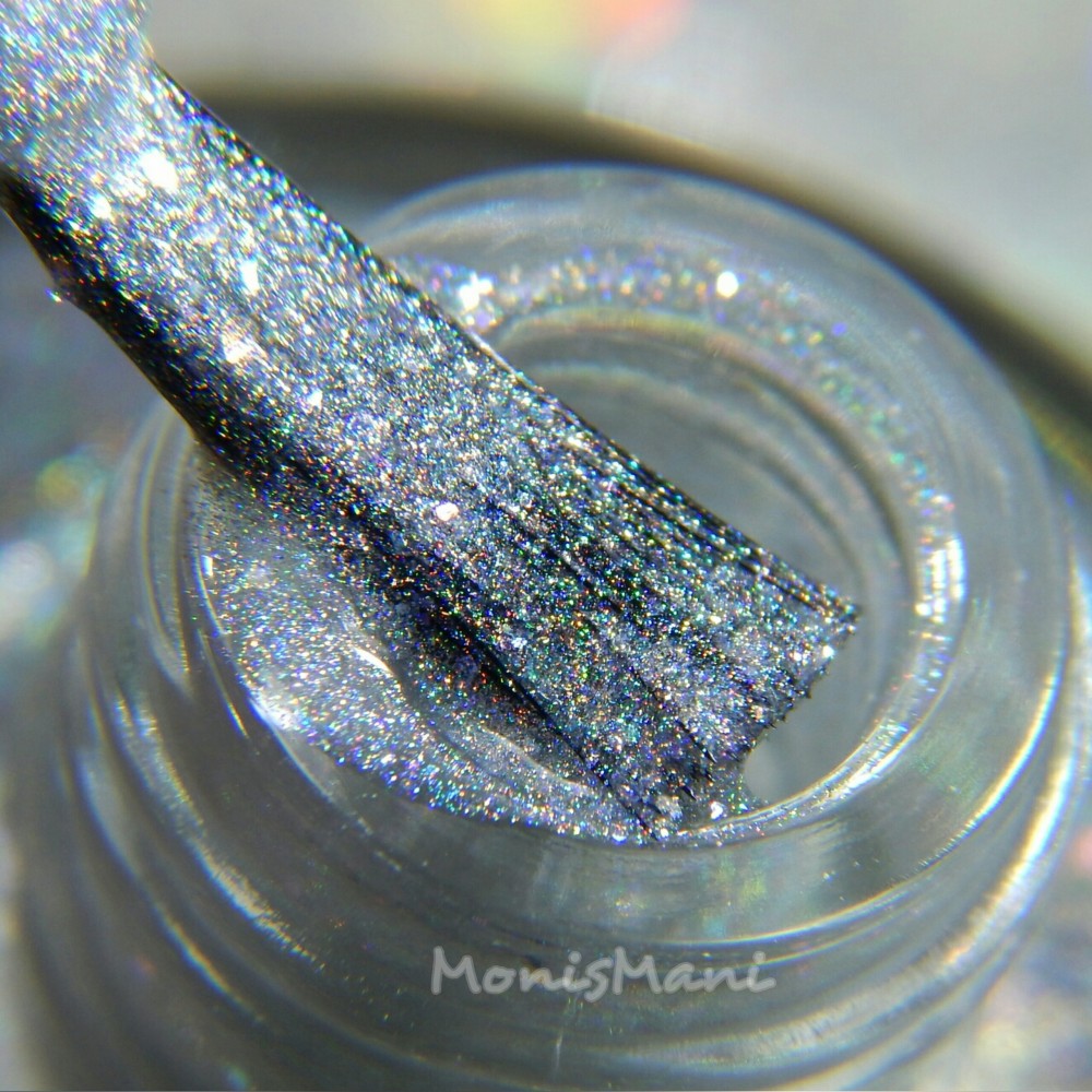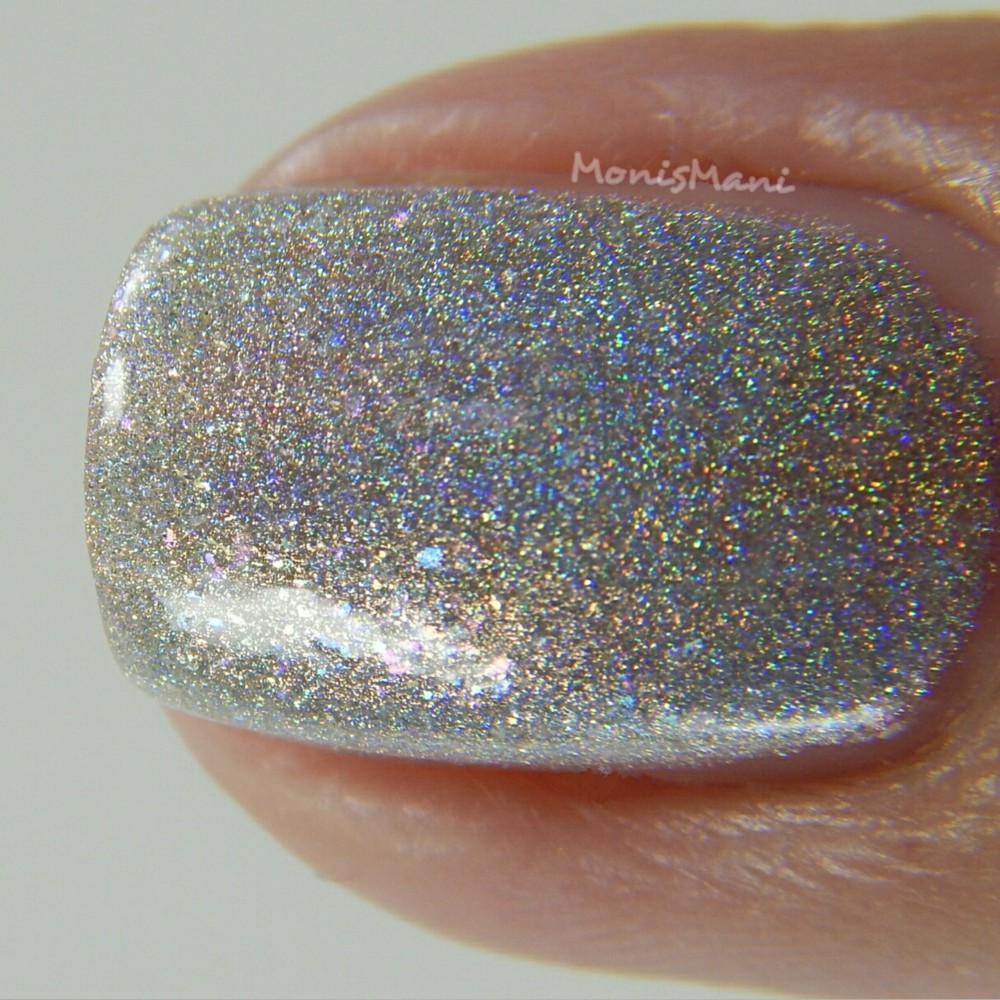 Is a pale silver with rainbow iridescent flakes, gold flash, and strong holographic shimmer.