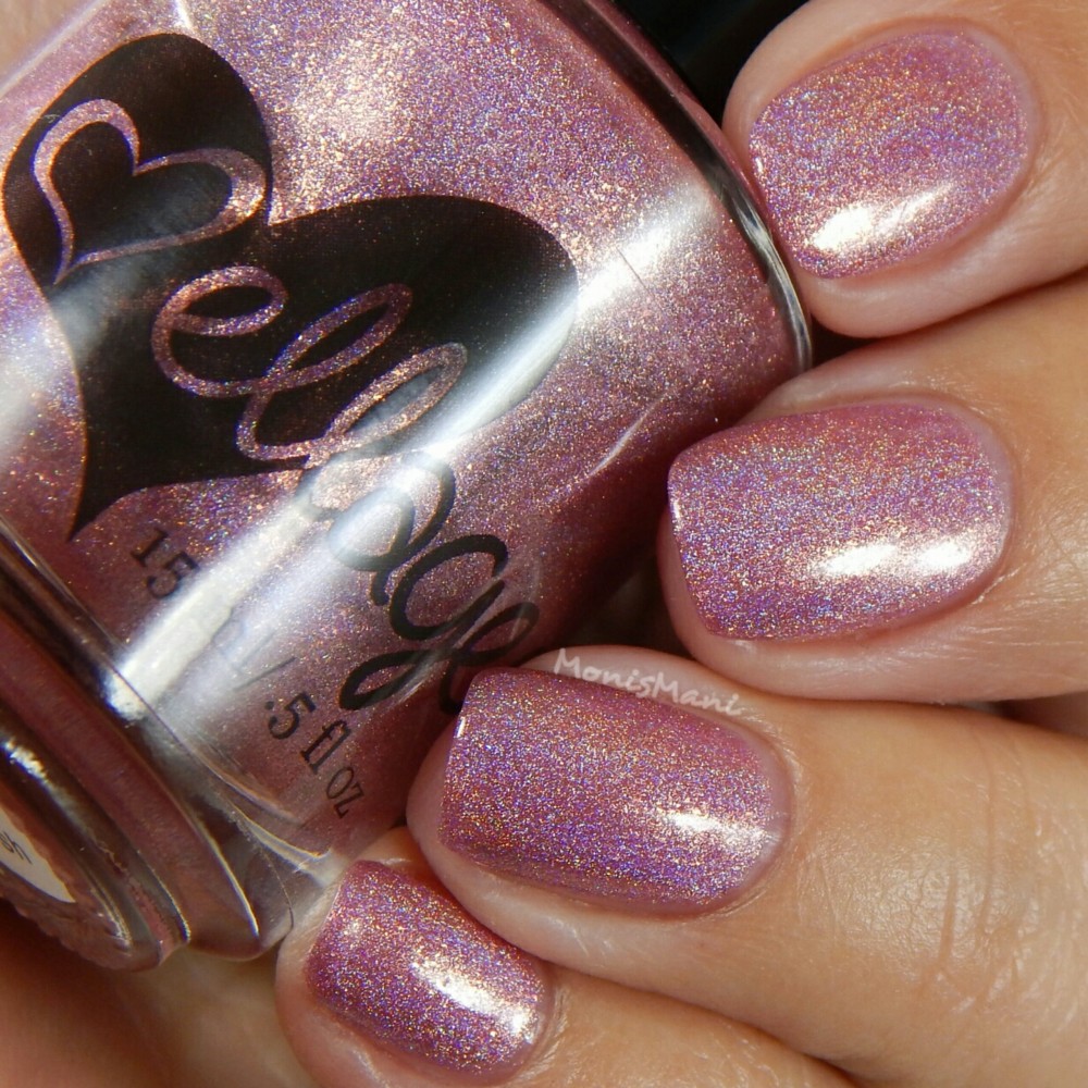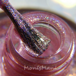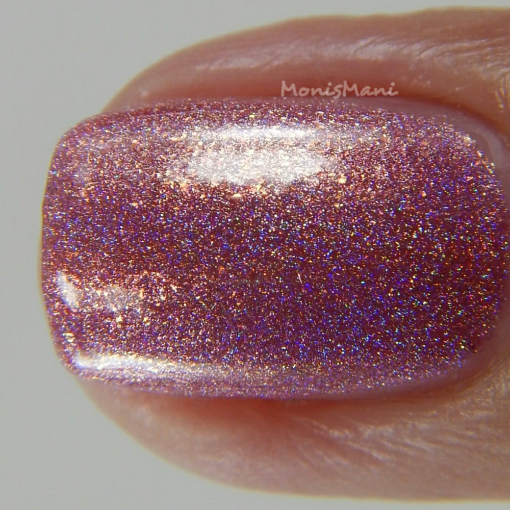 Is a rose/coral with flakes that shift from red-orange to gold, gold flash, and strong holographic shimmer.