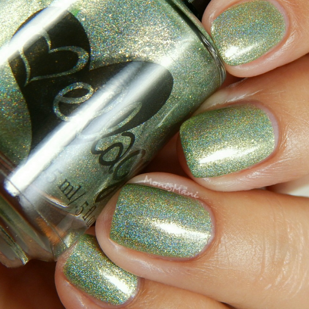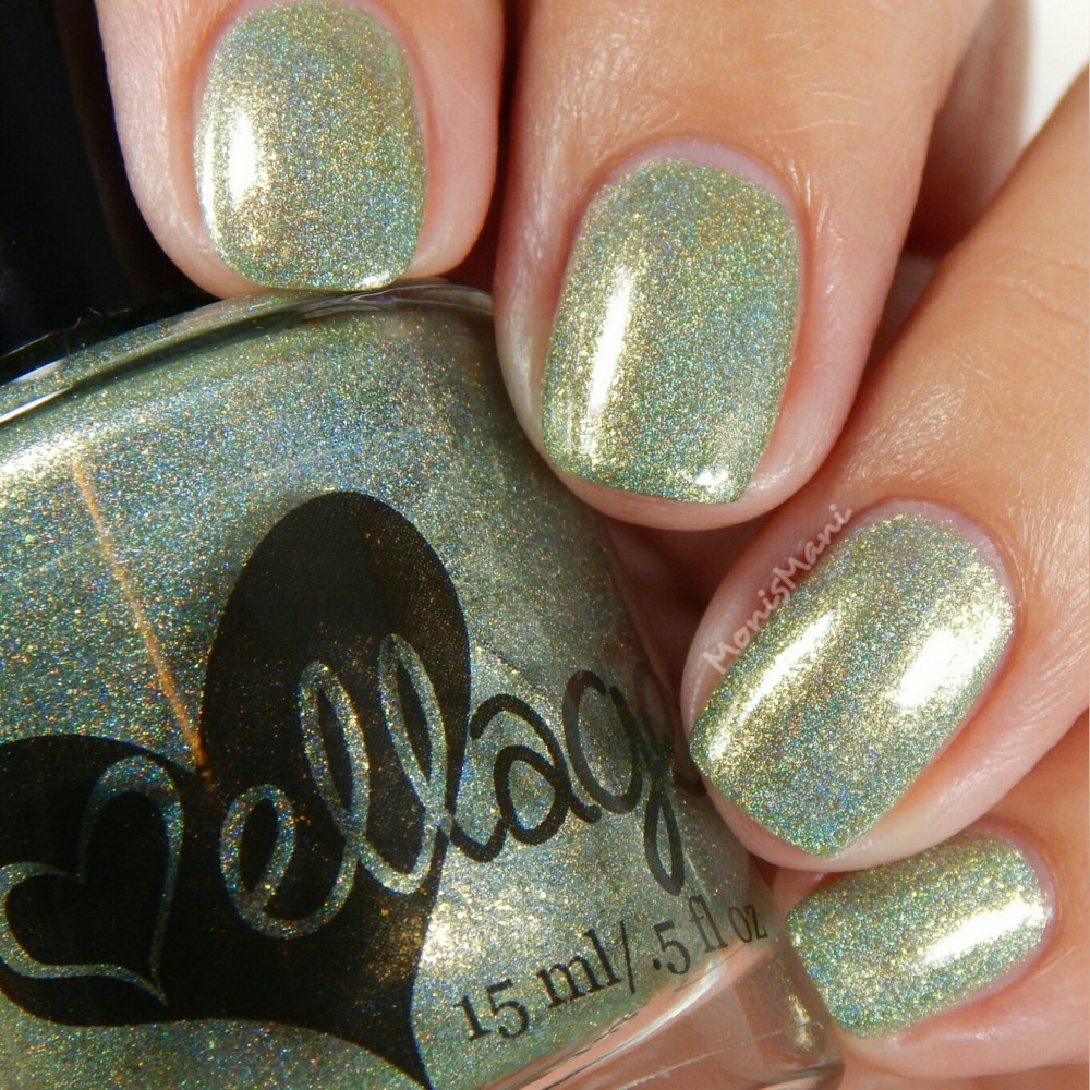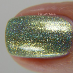 Is a sage green with flakes that shift from lime green to gold, gold flash, and strong holographic shimmer.