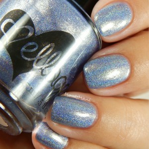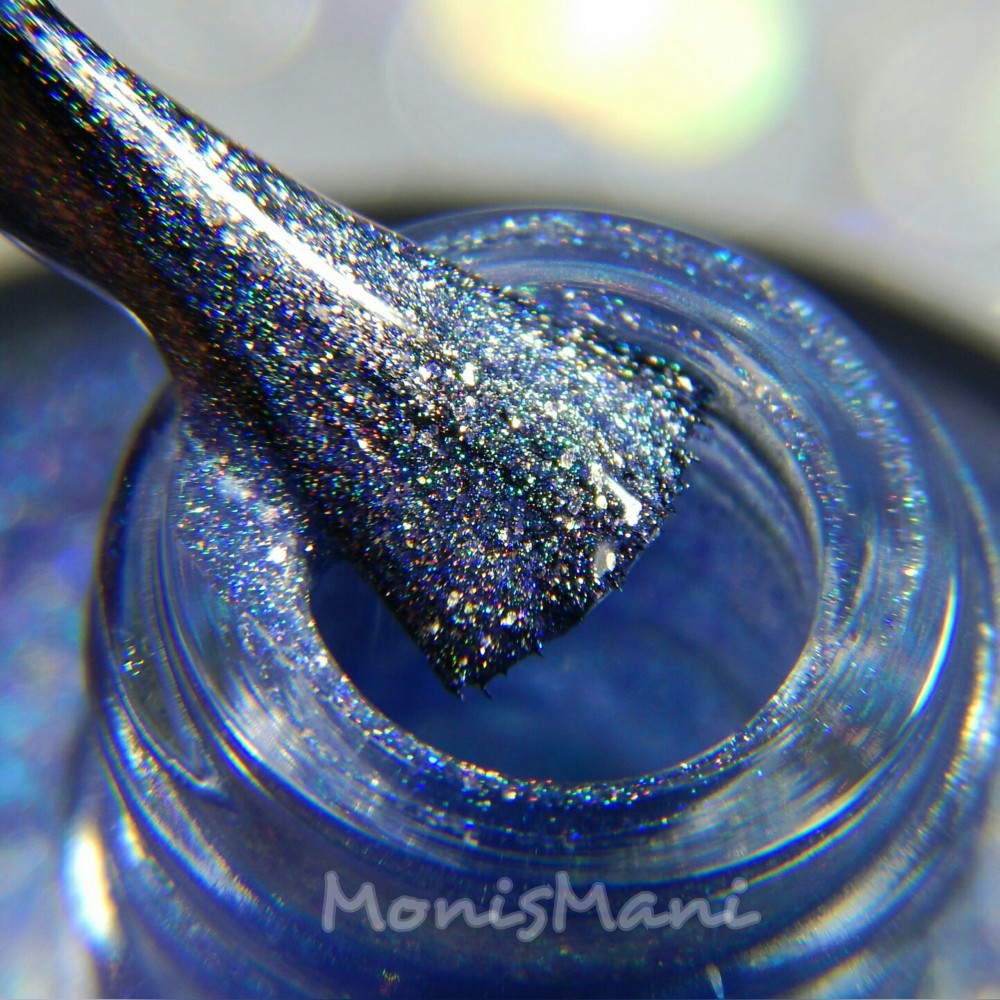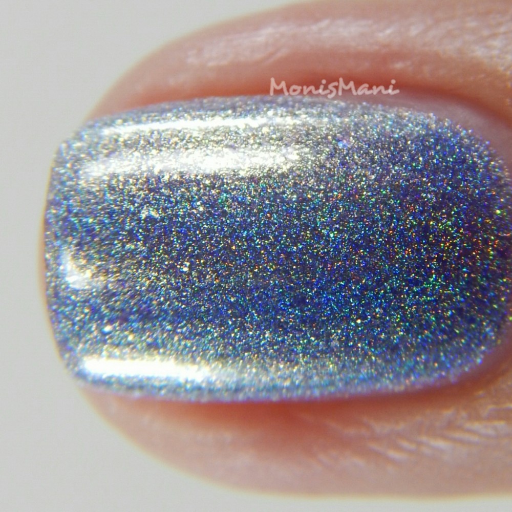 Is a periwinkle blue with flakes that shift from blue-violet to gold, gold flash, and strong holographic shimmer.