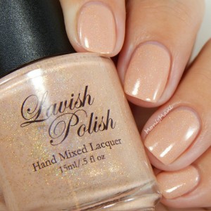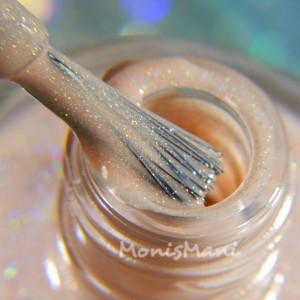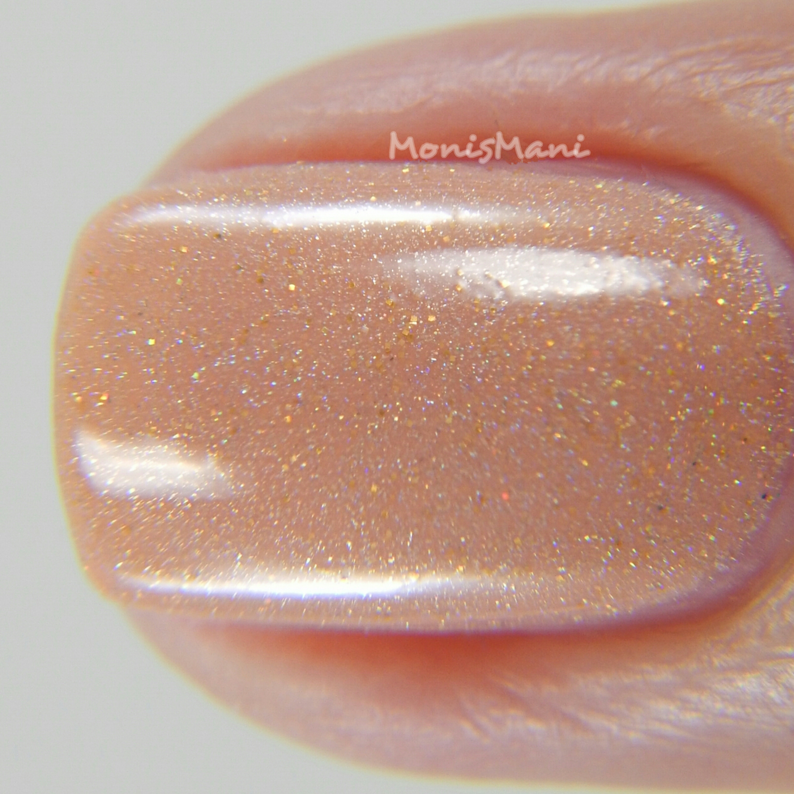 Is a beautiful and ever so soft peachy holo with gold holo micro glitter. You see three thin coats plus top coat in the pics.