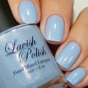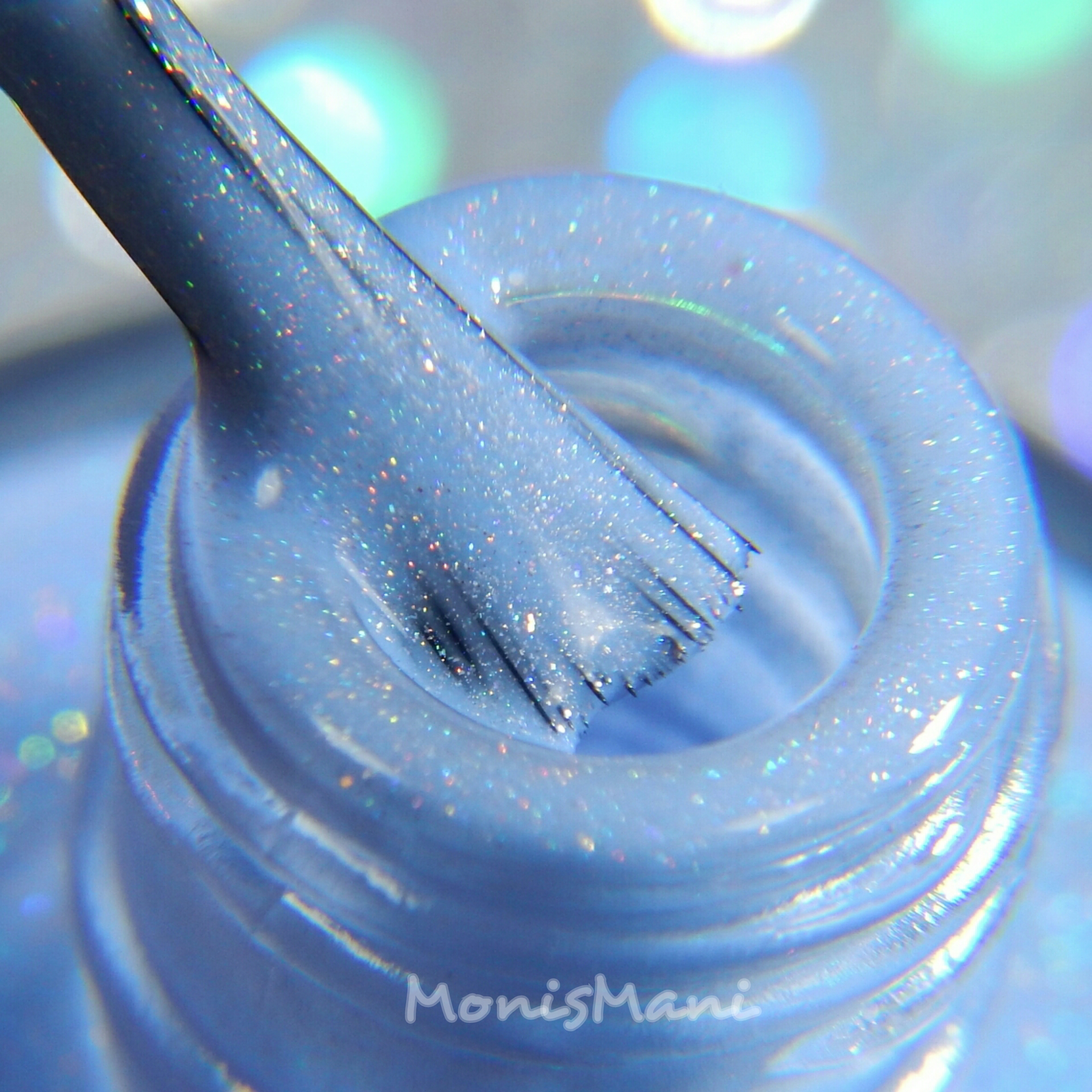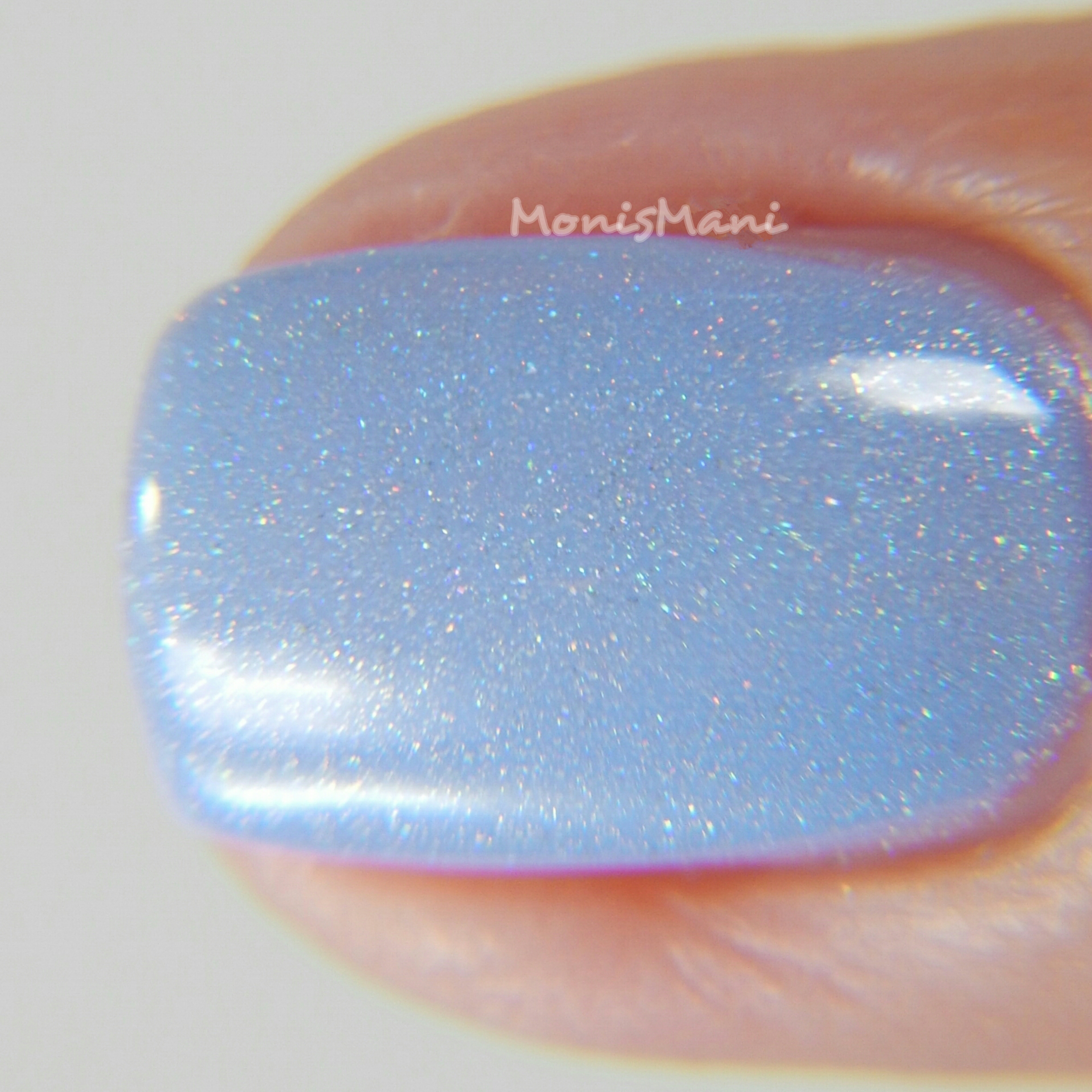 The maker describes this as a powder blue holo with silver holo micro glitter but I think it’s more of a periwinkle. Beautiful nonetheless!! You see three thin coats plus glossy top coat in the pics.