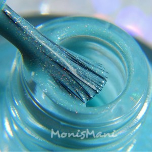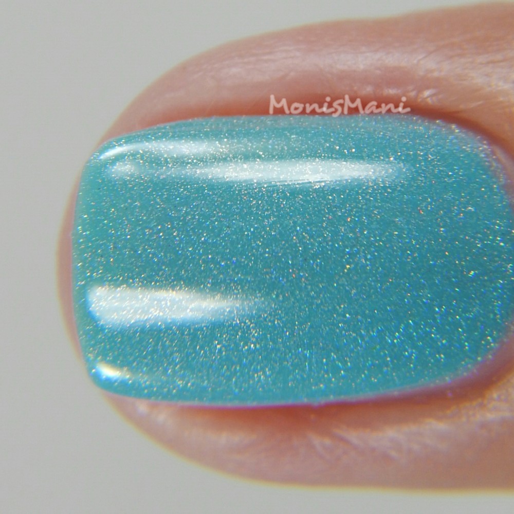 Is a beautiful mint blue holo with silver holo micro glitter. Such a beauty!! You see three thin coats plus top coat in the pics.