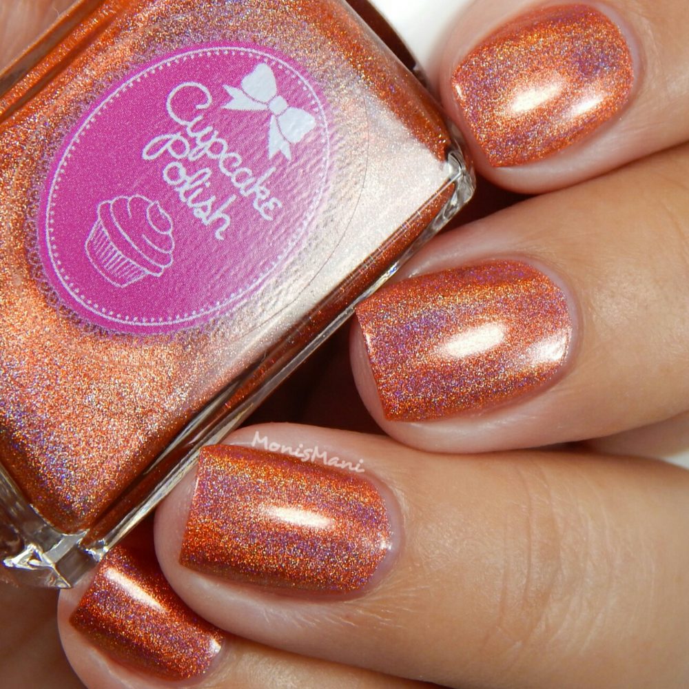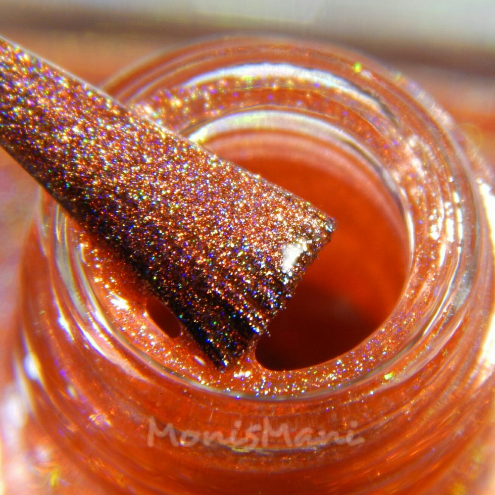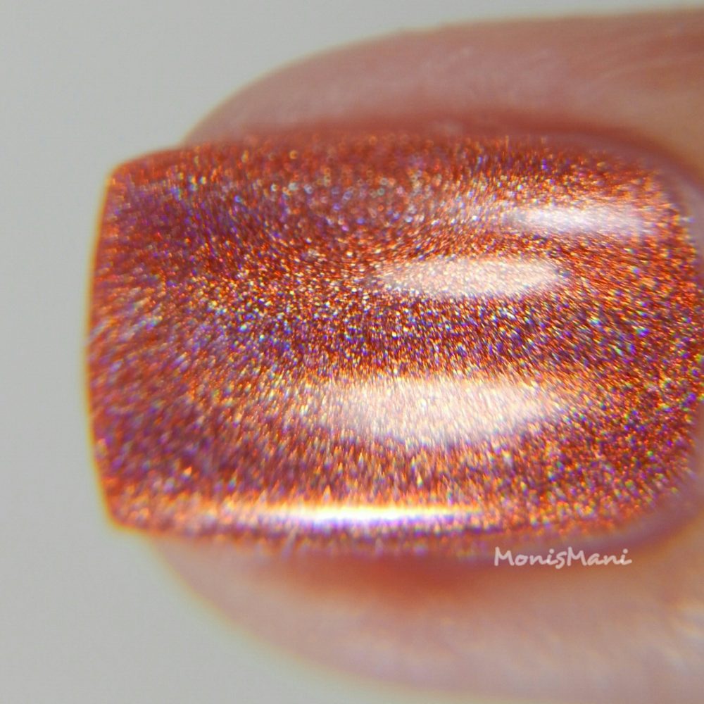 Is a beautiful orangey copper strong linear holo. Two coats plus glossy top coat in the pics. Third picture is sun shot.
