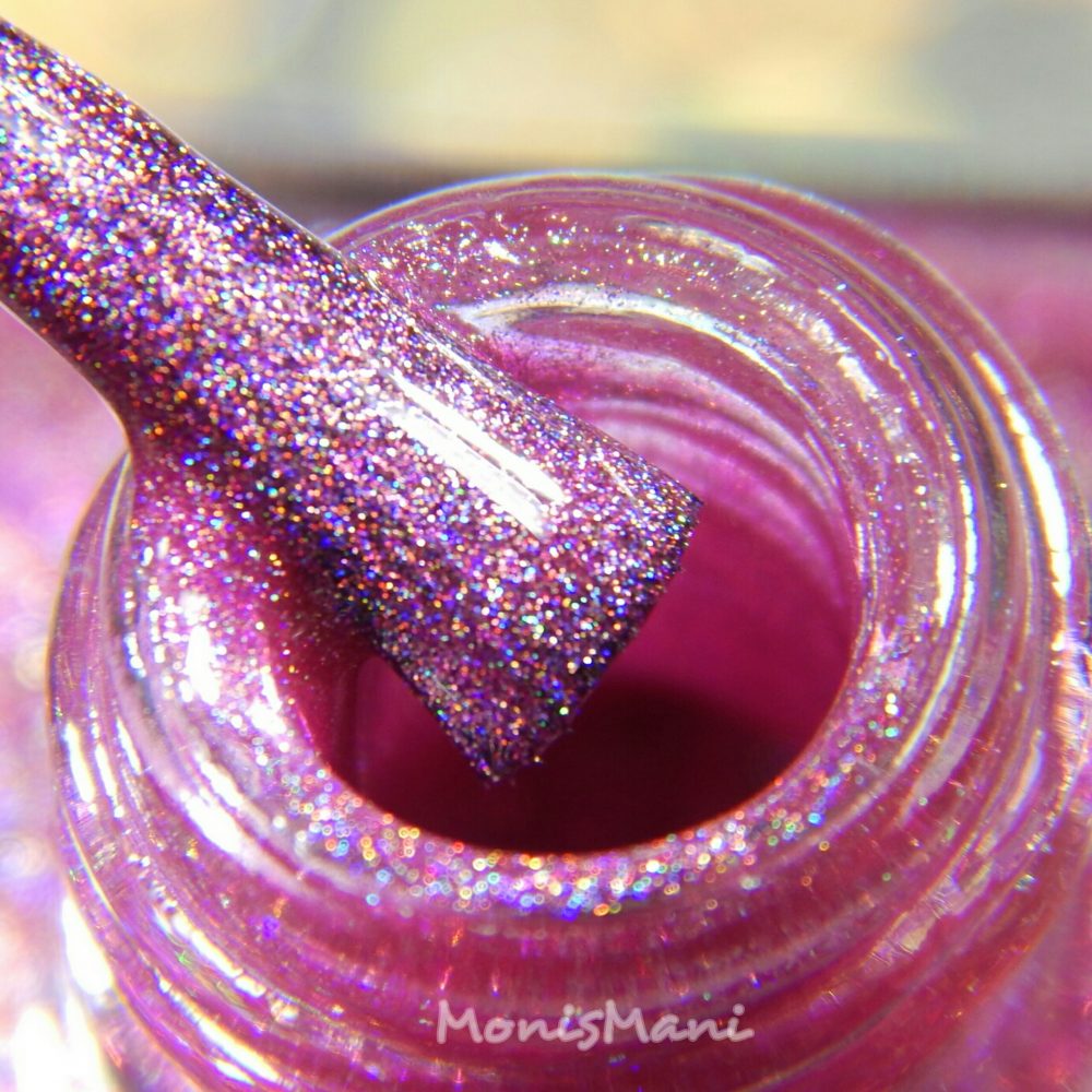 Strong hot pink linear holo. You see two coats plus glossy top coat in the pics. Third pic is sun shot.