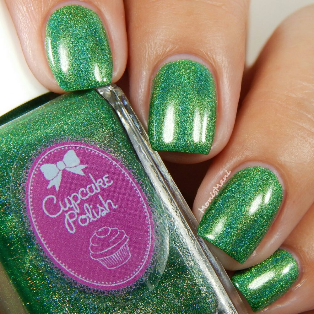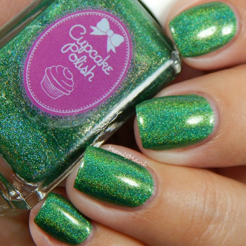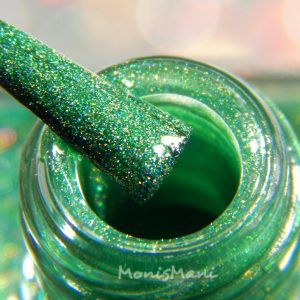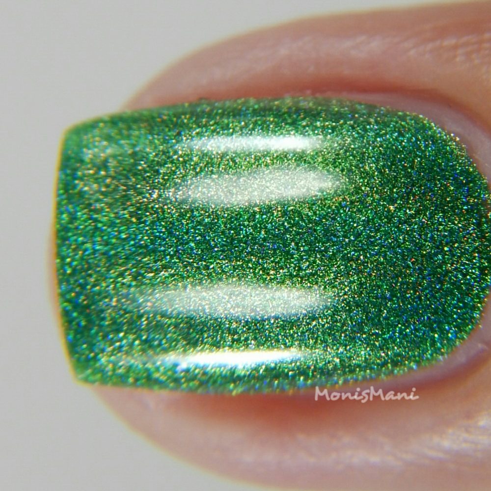 Is a gorgeous grass-green strong linear holo. Two coats plus glossy top coat in the pics. Third pic is sun shot.