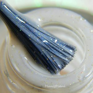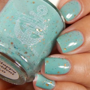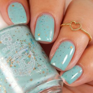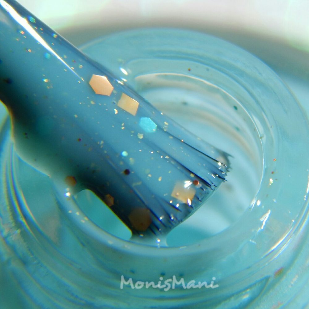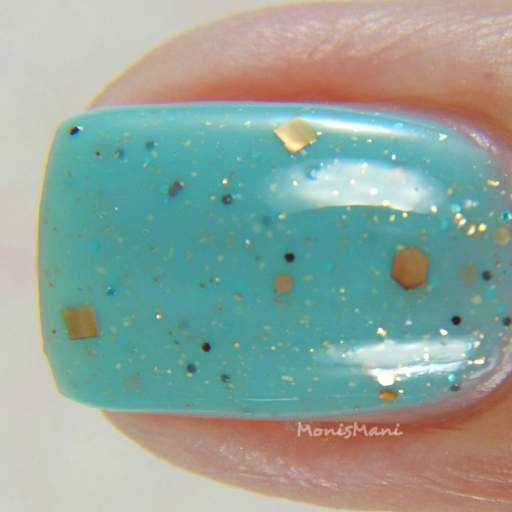 Is a light turquoise crelly style polish with various sizes of holographic and matte glitter in turquoise, bronze and gold. You see four coats plus top coat in the pics.