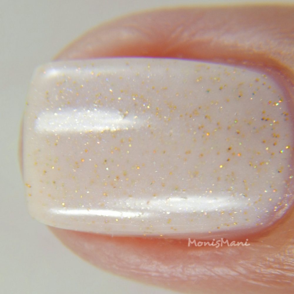 Is a super pretty beige nude with a tiny hint of purple iridescent shimmer and packed with gold and copper tiny holo glitters. You see four coats plus glossy top coat in the pics.