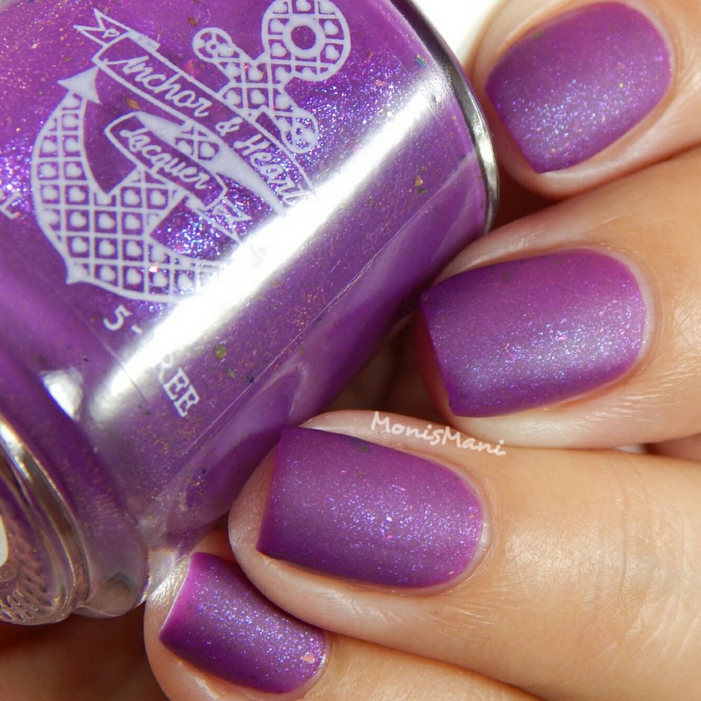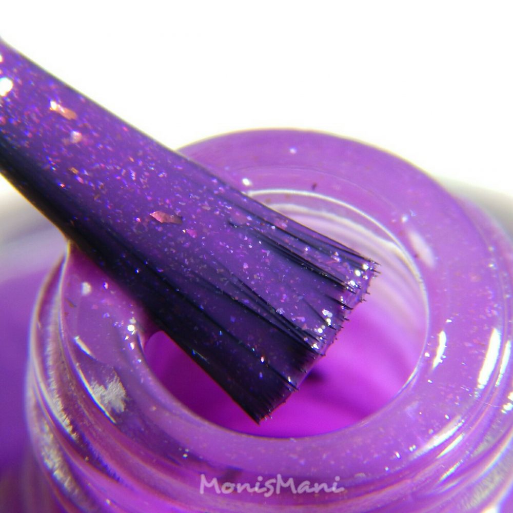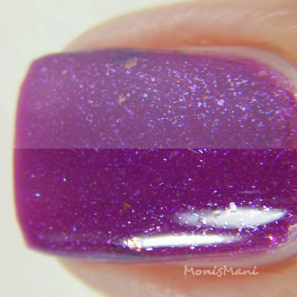 Is a medium purple crelly with violet/pink/gold shifting flakies, and a hint of blue shift. You see three thin coats plus glossy and matte top coats in the pics. Macro is top with matte top coat and bottom with glossy.