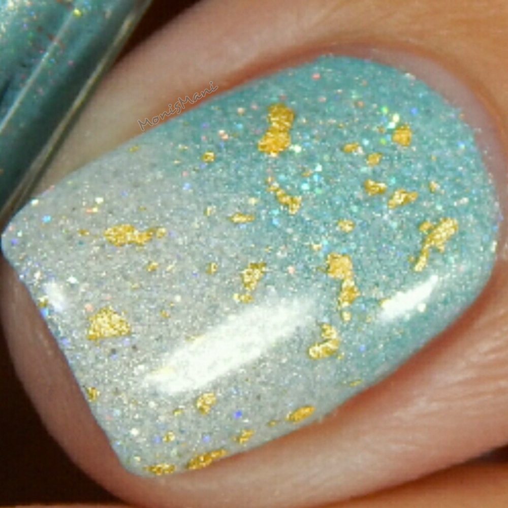 For my gradient I used It’s Now or Never as base and sponged on If I can Dream on the tips, I protected my fingers/cuticles with Vibrant Vinyls Latex Peel Off (not shown in the pic) and topped with ellagee’s Golden Lotus. I did a lot of searching before purchasing a gold flake topper and am absolutely in love and happy with my decision to buy the ellagee one.. it’s gorgeous and just what I wanted.